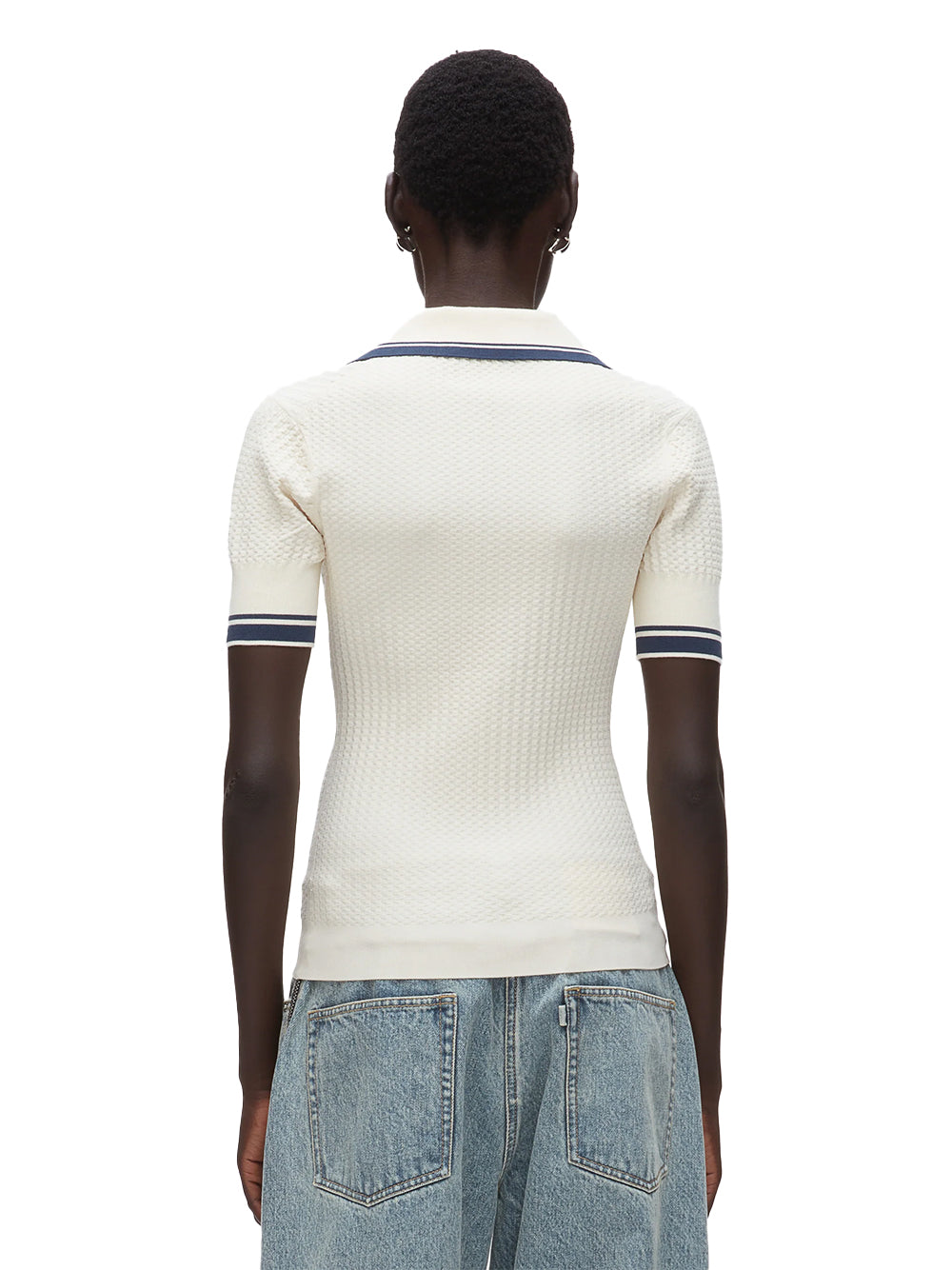 Crafted in a refined fine-gauge knit, this versatile polo is rendered in a dimensional textured rib. The silhouette is seasonless and feminine, accented with a subtle sporty edge through cotton rib trims and a polo collar finished with contrast stripes. Slim-fitting and easy to style, it pairs effortlessly with denim, tailoring, or skirts for everyday polish.