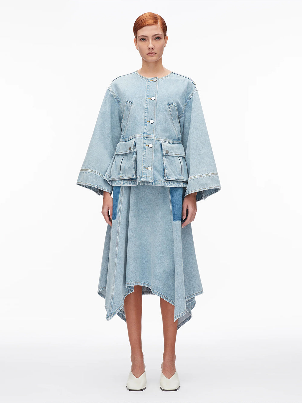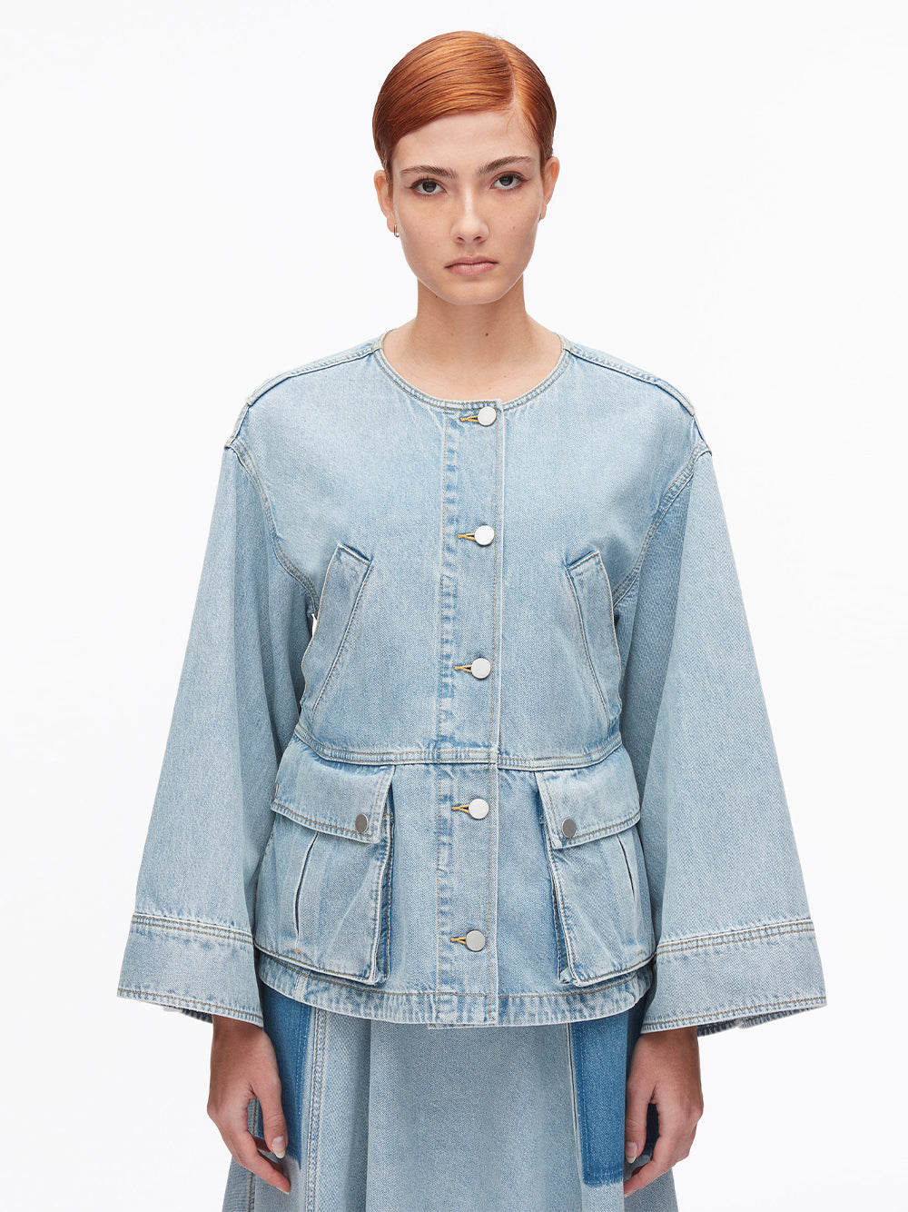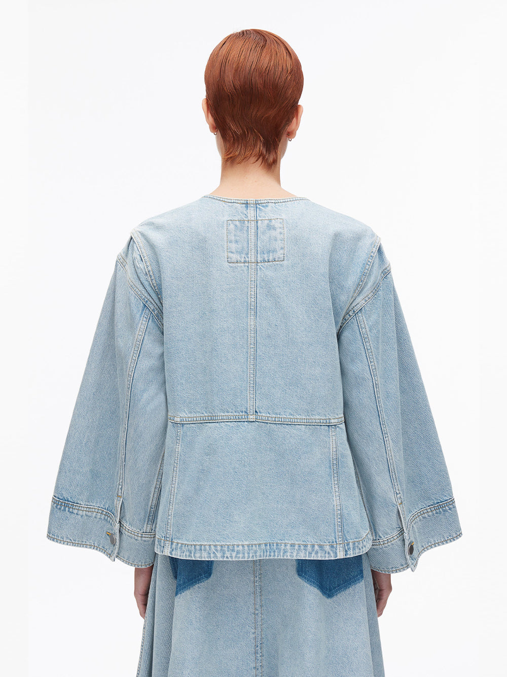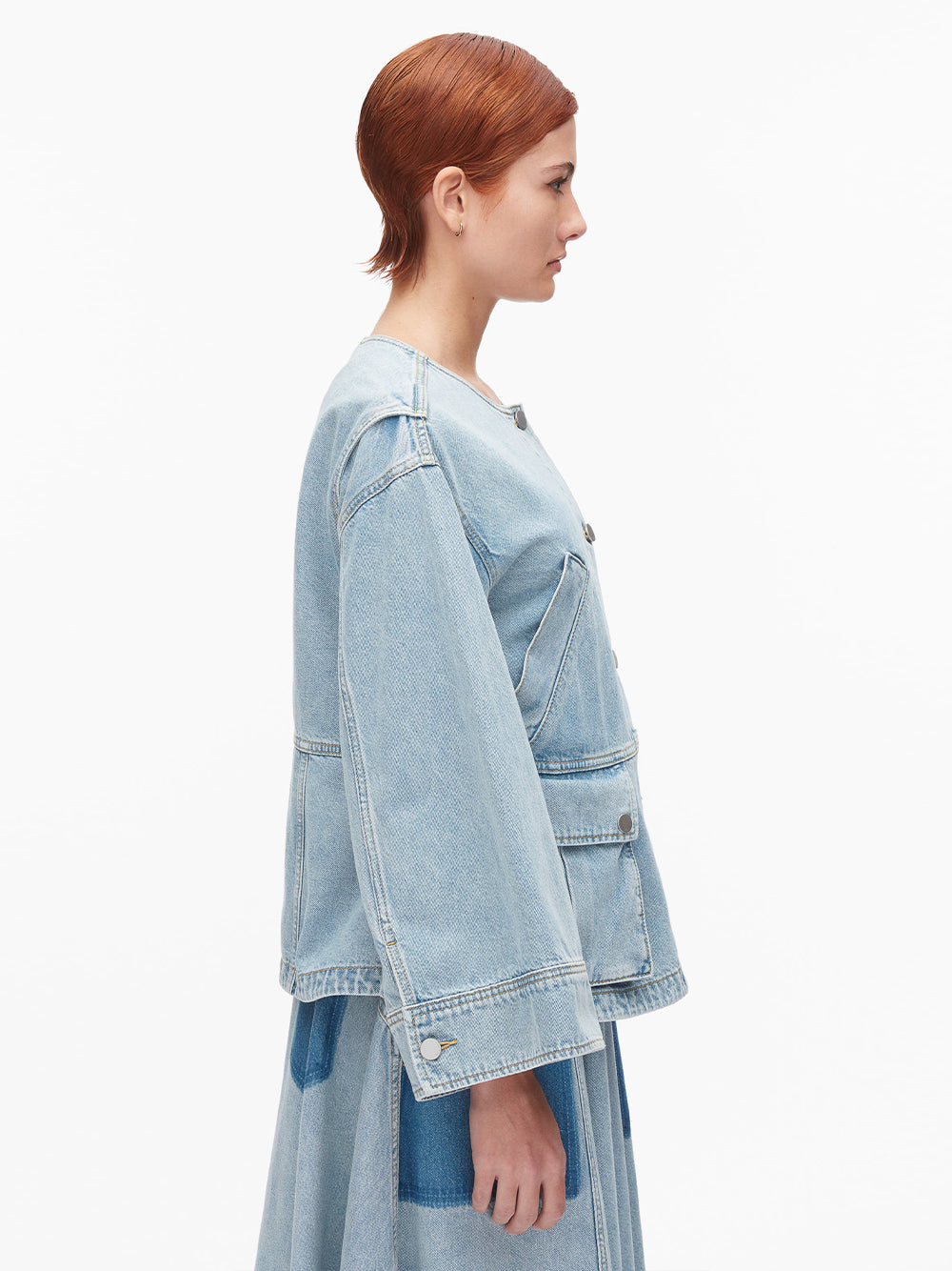 Denim done differently. This collarless jacket is defined by a swingy trapeze shape that's light, airy, and easy to wear. Thoughtful pocket placement—welt pockets above the waist and flap pockets below—adds practical function. The open shape allows for comfortable layering, designed with spring in mind.