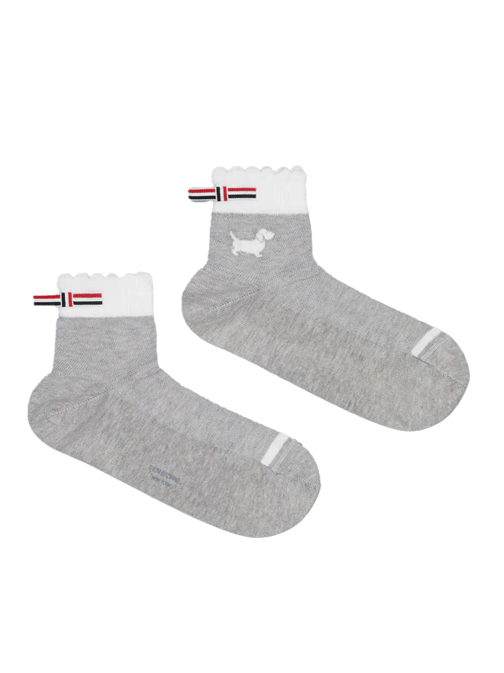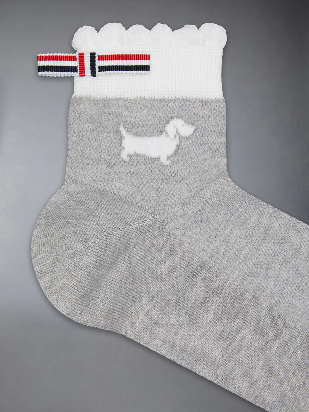 A softer expression of Thom Browne’s signatures. These crew-length socks are knit in airy cotton with a pointelle stitch and finished with a Hector intarsia at the outer ankle. A scalloped cuff and grosgrain tab complete the silhouette—delicate in detail, but grounded in the uniform.
