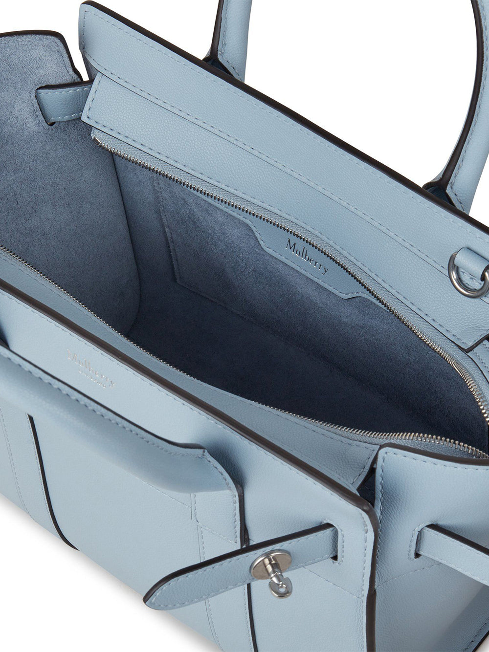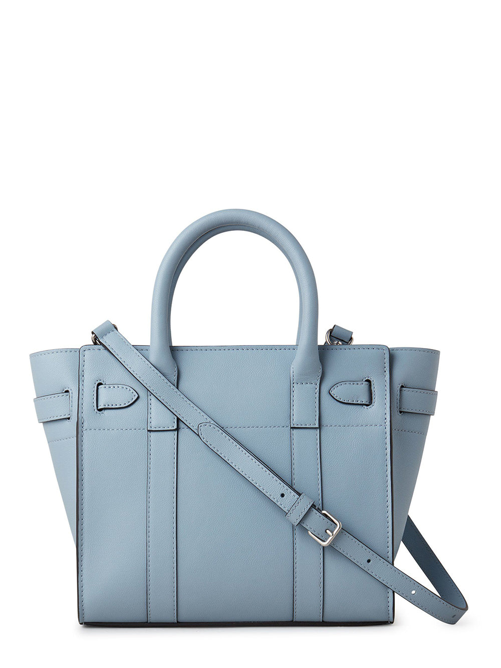 กระเป๋าสะพายไหล่ สี Poplin Blue รุ่น Mini Zipped Bayswater ผลิตจากหนังแท้ ทรงโท้ทมินิแบบมีซิปเปิด มาพร้อมหูจับแบบคู่ และสายสะพายปรับระดับได้ แต่งแถบตัวล็อคแบบกดด้านหน้า ตกแต่งดีปั๊มโลโก้แบรนด์ Mulberry ด้านหน้า