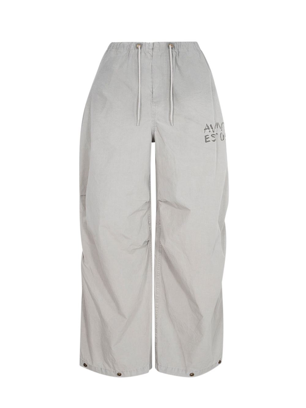These stone-grey parachute pants feature a stacked, articulated leg with a pleat at the ankle and logo embroidery on the left hip. They fasten with a zip fly and snap closure.
