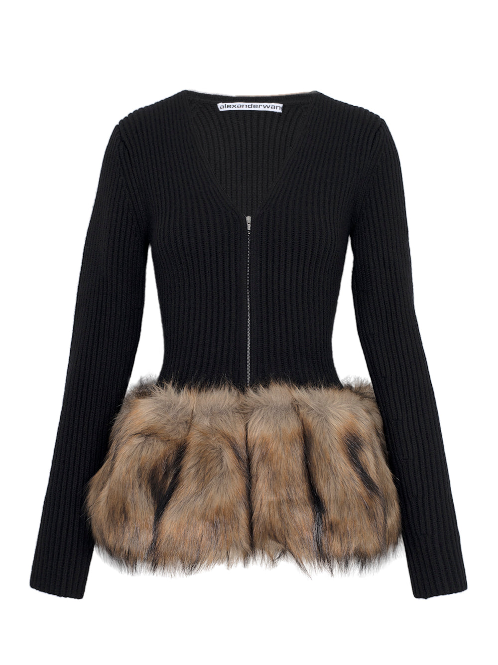 Black boiled wool cardigan in fisherman rib knit, designed with a voluminous faux fur peplum at the waist. A two-way front zip allows versatile styling, while the hand-finished fur hem creates sculptural movement.