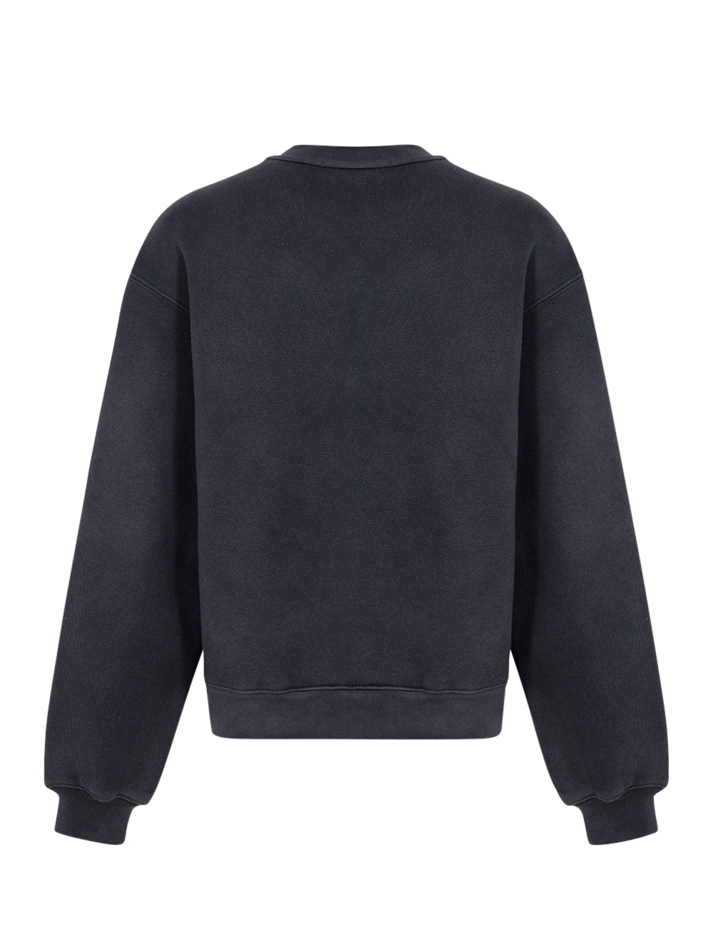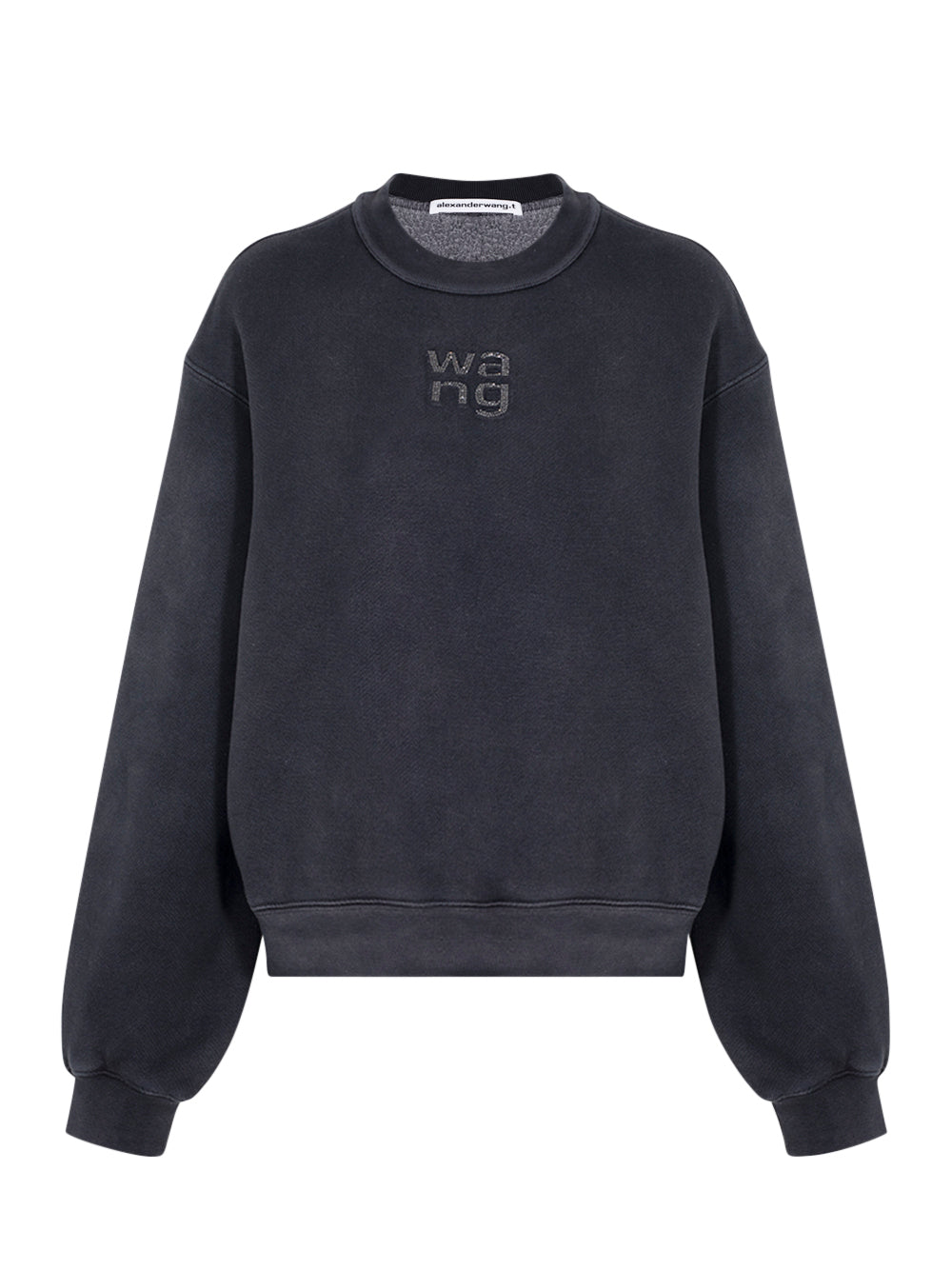Washed black crewneck sweatshirt in organic essential terry. Designed with a relaxed silhouette and detailed with a stacked embossed wang logo layered under a hotfix finish