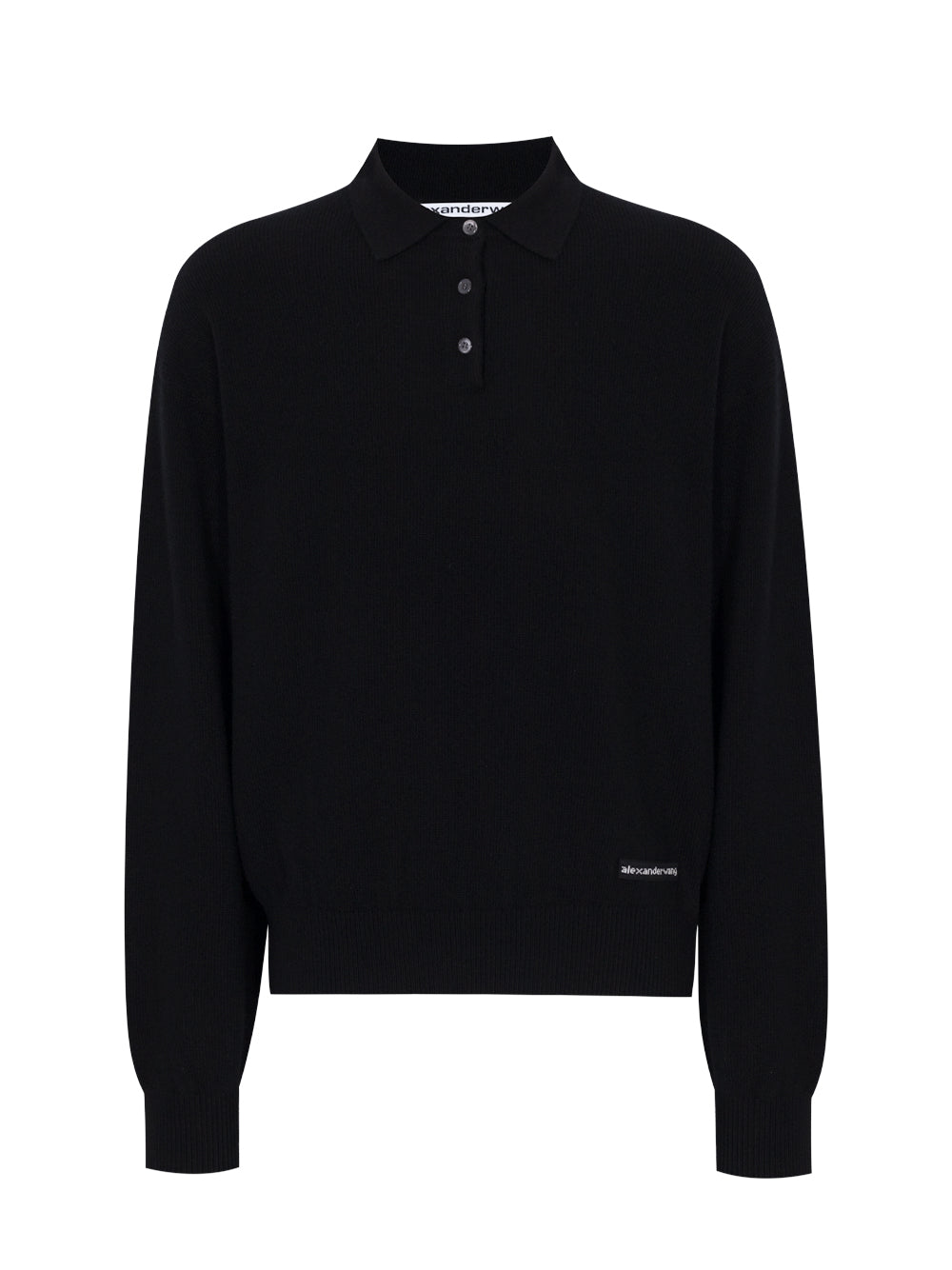 Long sleeve henley pullover in classic black wool with an oversized fit and hip-length hem. Features a faux horn button placket at the front and a tonal alexanderwang knit logo patch at the lower left hem.