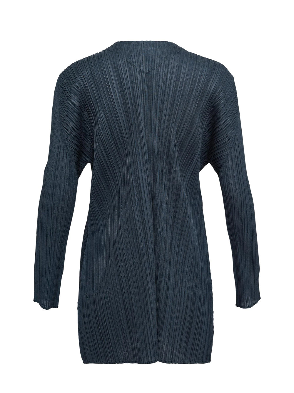 This saxe blue mid-length pleated coat has an open front and side pockets. The elegantly flared silhouettes of MELLOW PLEATS are made from a soft, matte fabric.