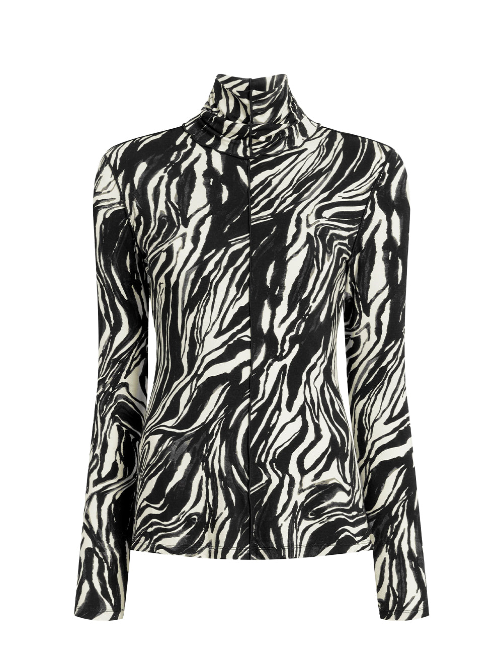 The Audrey Top in Marble Jersey features a slim long-sleeve turtleneck adorned with an all-over abstract motif.
