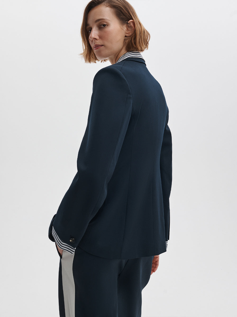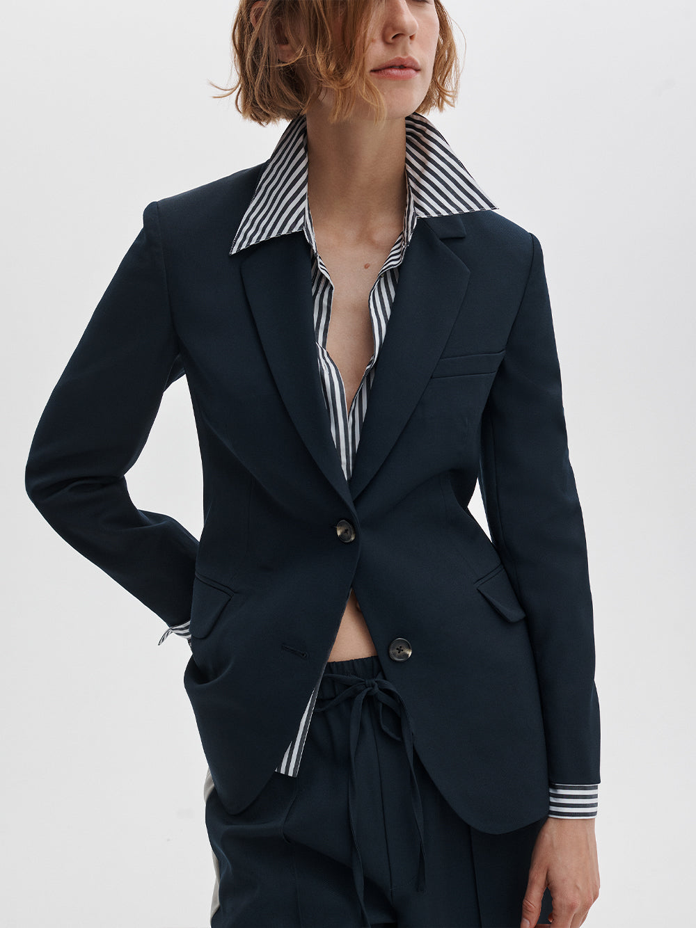 Suit yourself. This two-button blazer has a cinched waist and falls below the hip. Tailored from soft wool, it features a detachable striped shirt inlay and matching cuffs that create the illusion of layers.