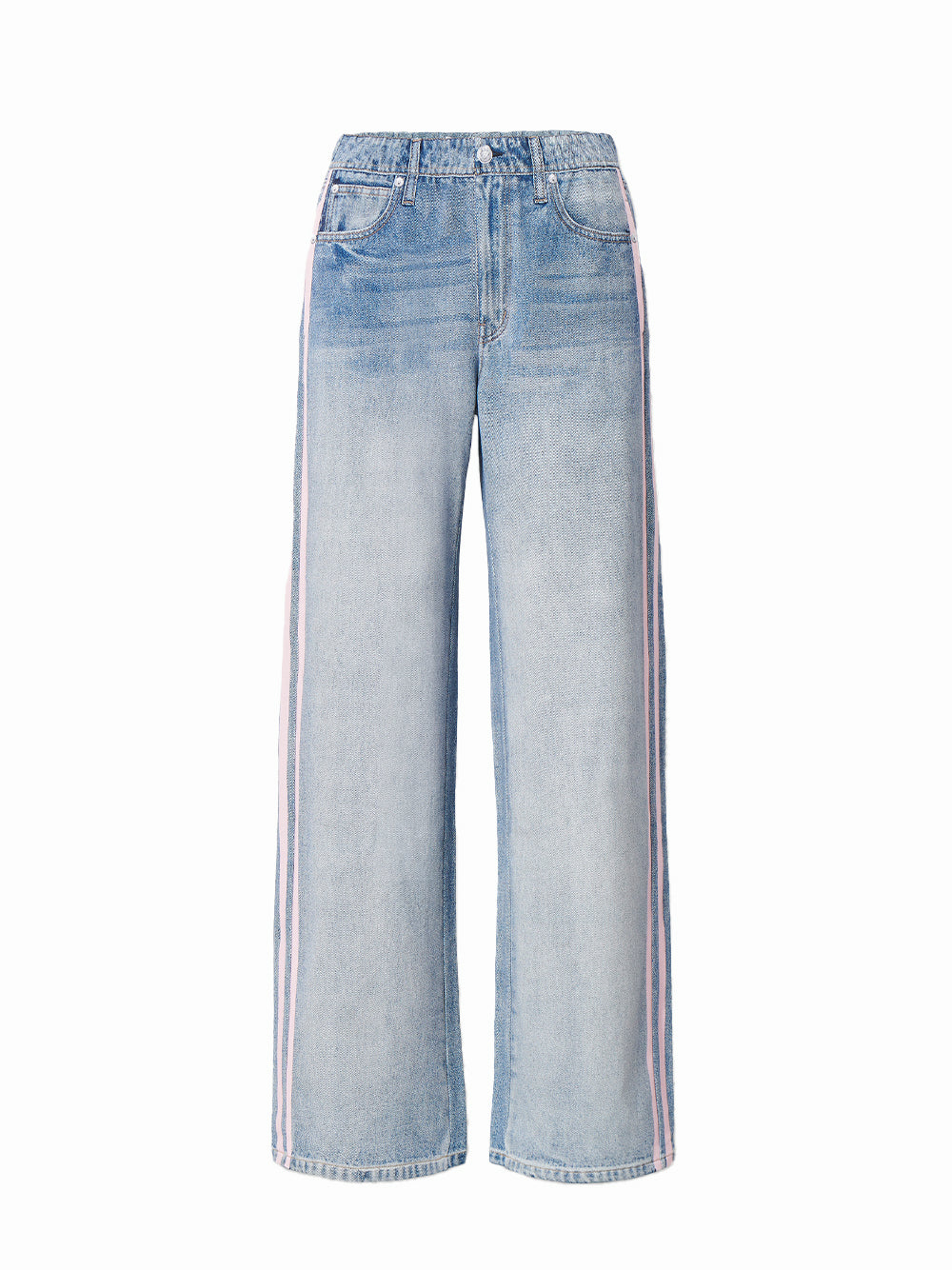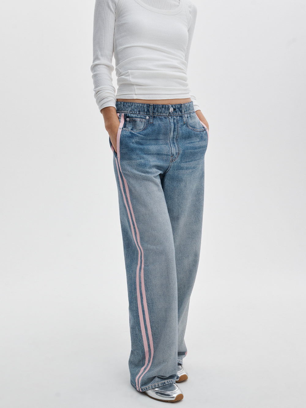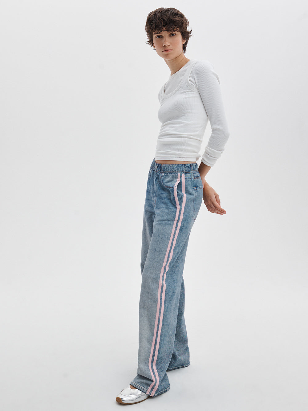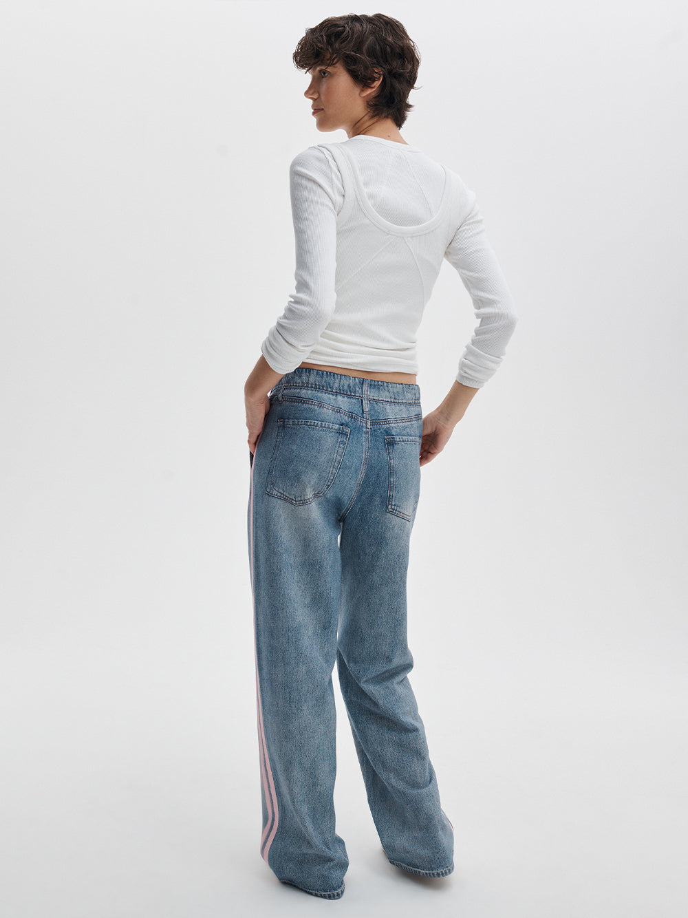 rb Miramar, our signature printing technique, creates the illusion of denim on any fabric. These track pants fuse the look of lived-in jeans with the comfort of sweats and vibrant side stripes. Nearly every denim detail is digitally printed on soft cotton terry, from the five-pocket silhouette to the button and belt loops. Together with their pull-on elastic waistband and relaxed, wide-leg fit, they blur the line between jeans and sweatpants, making them a colorful addition to your closet.