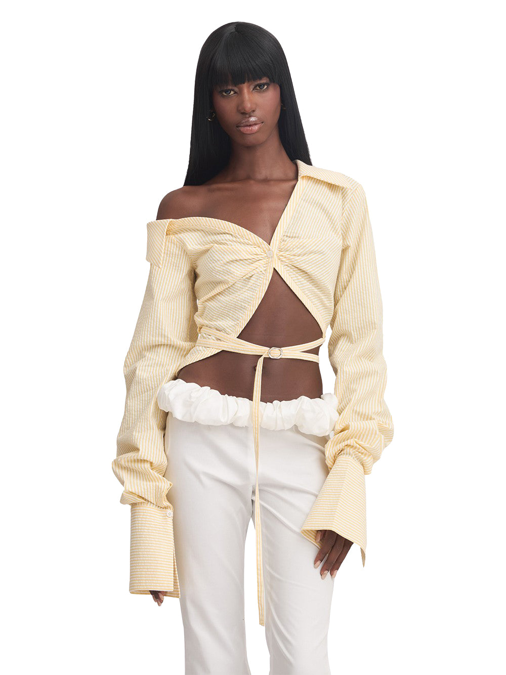 Off Shoulder Cropped Shirt (Stripe) Yellow