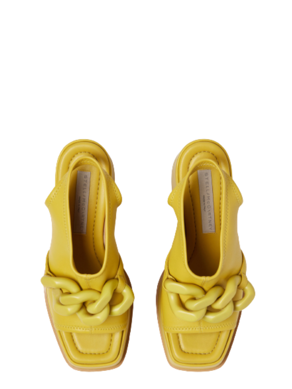 รองเท้าส้นตึกสำหรับคุณสุภาพสตรีคู่นี้ โดดเด่นด้วยโซ่ขนาดใหญ่ด้านหน้ารองเท้า ที่ถือว่าเป็น signature ของ Stella McCartney รองเท้าถูกออกแบบให้เปลือยหน้าเท้า และมีสายคาดด้านหลัง