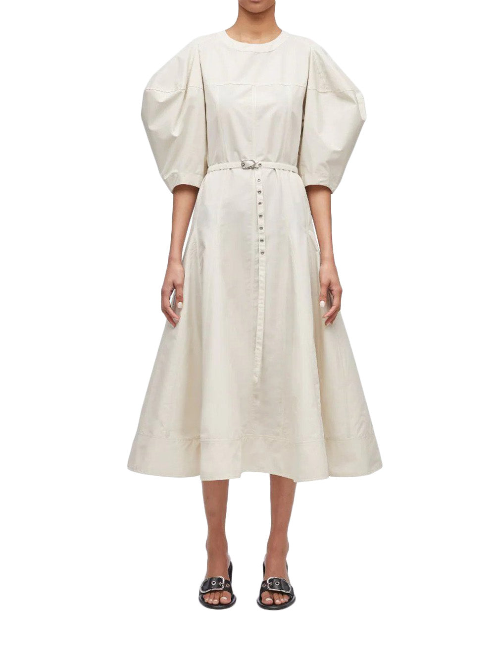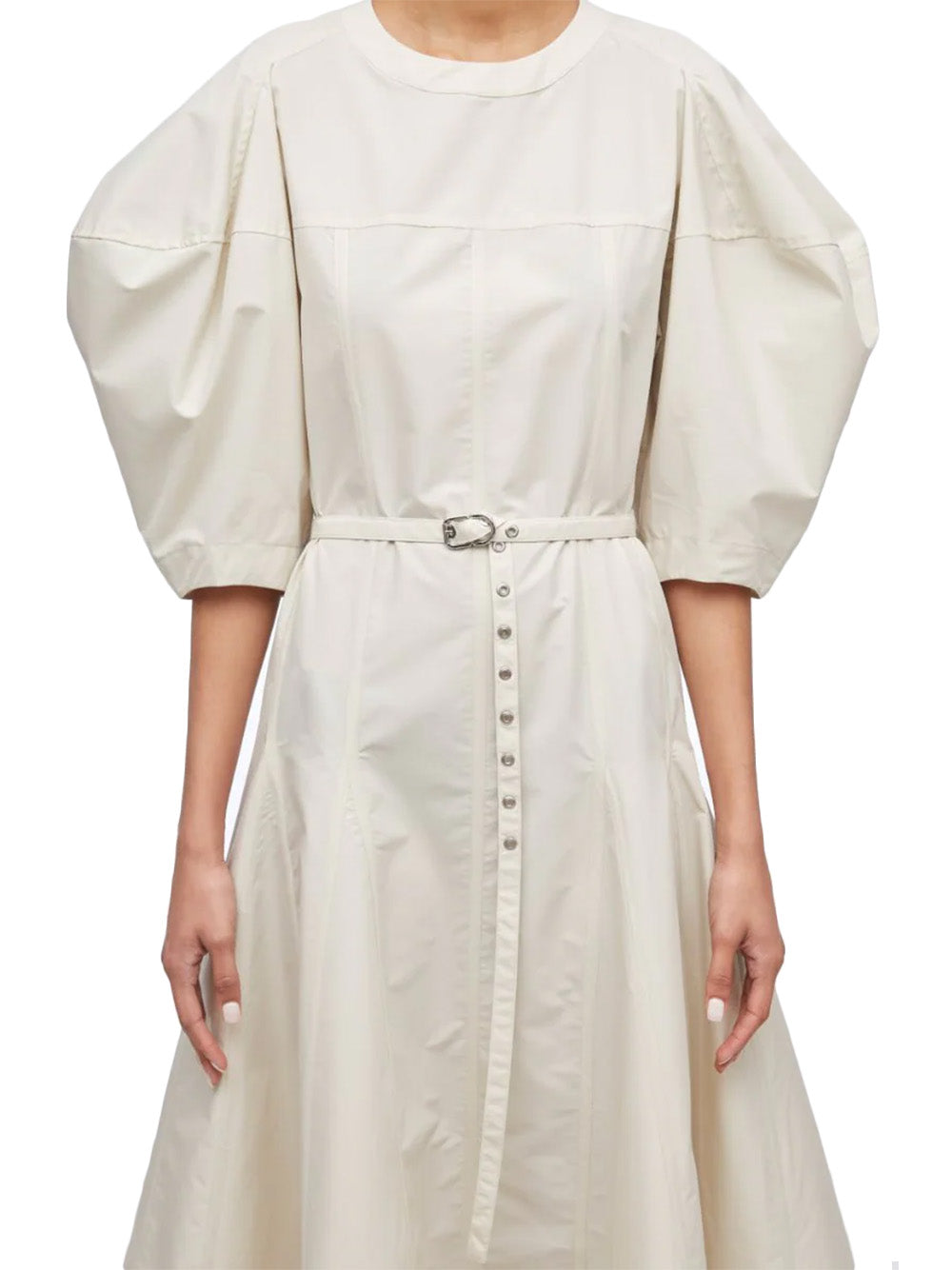 เดรสคอกลมผ้าฝ้ายสีครีม ดีเทลแขนเสื้อพอง เอวแต่งเข็มขัด ชายกระโปรงบาน