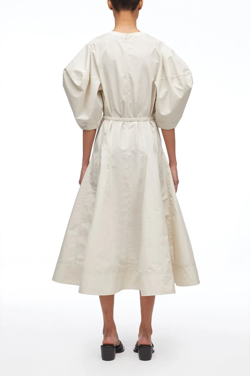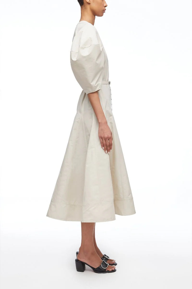 Puff Sleeve Belted Godet Midi Dress (Stone)