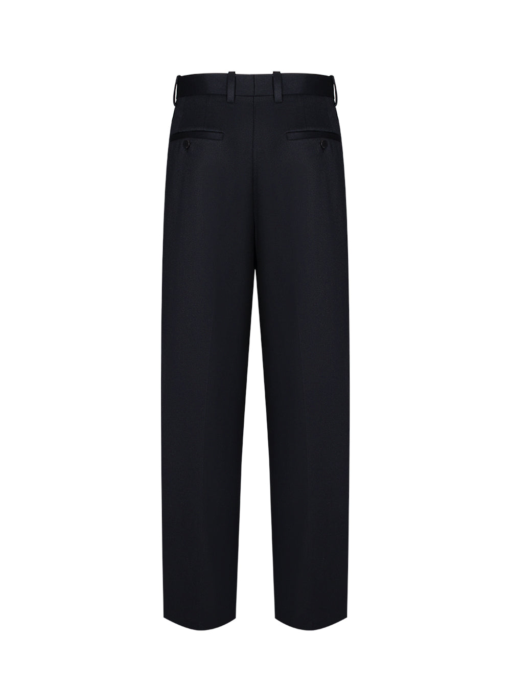 Introducing wool trousers. These trousers feature sturdy belt loops for a secure fit. The waistband is adorned with stylish logo hardware. They come with four convenient pockets. The legs are elegantly creased for a polished look. The silver-tone hardware is engraved with our logo for a touch of sophistication.