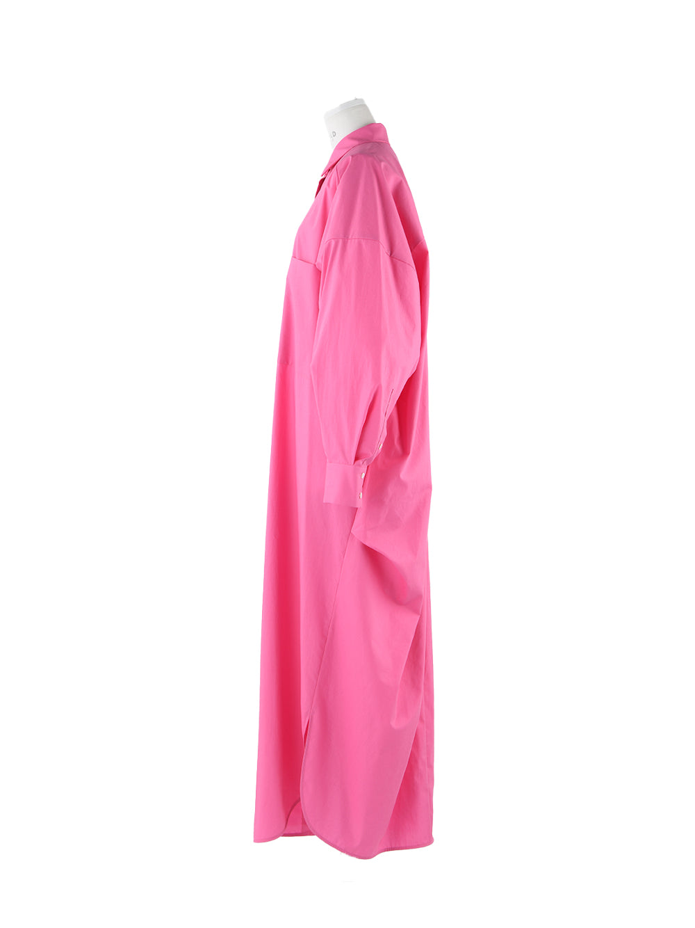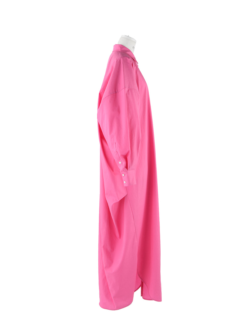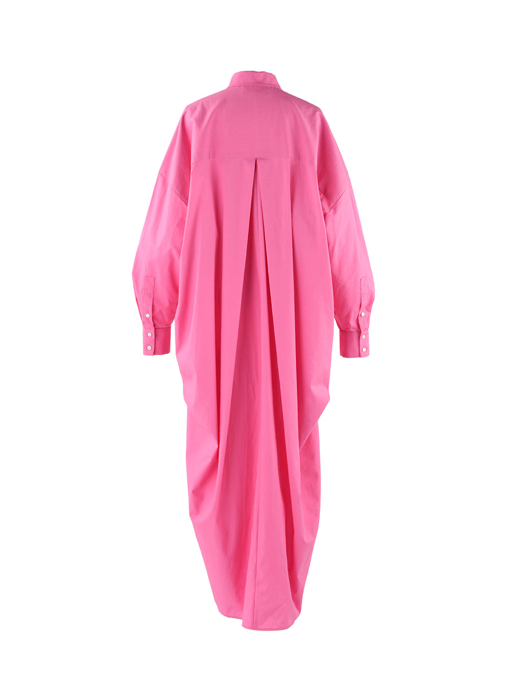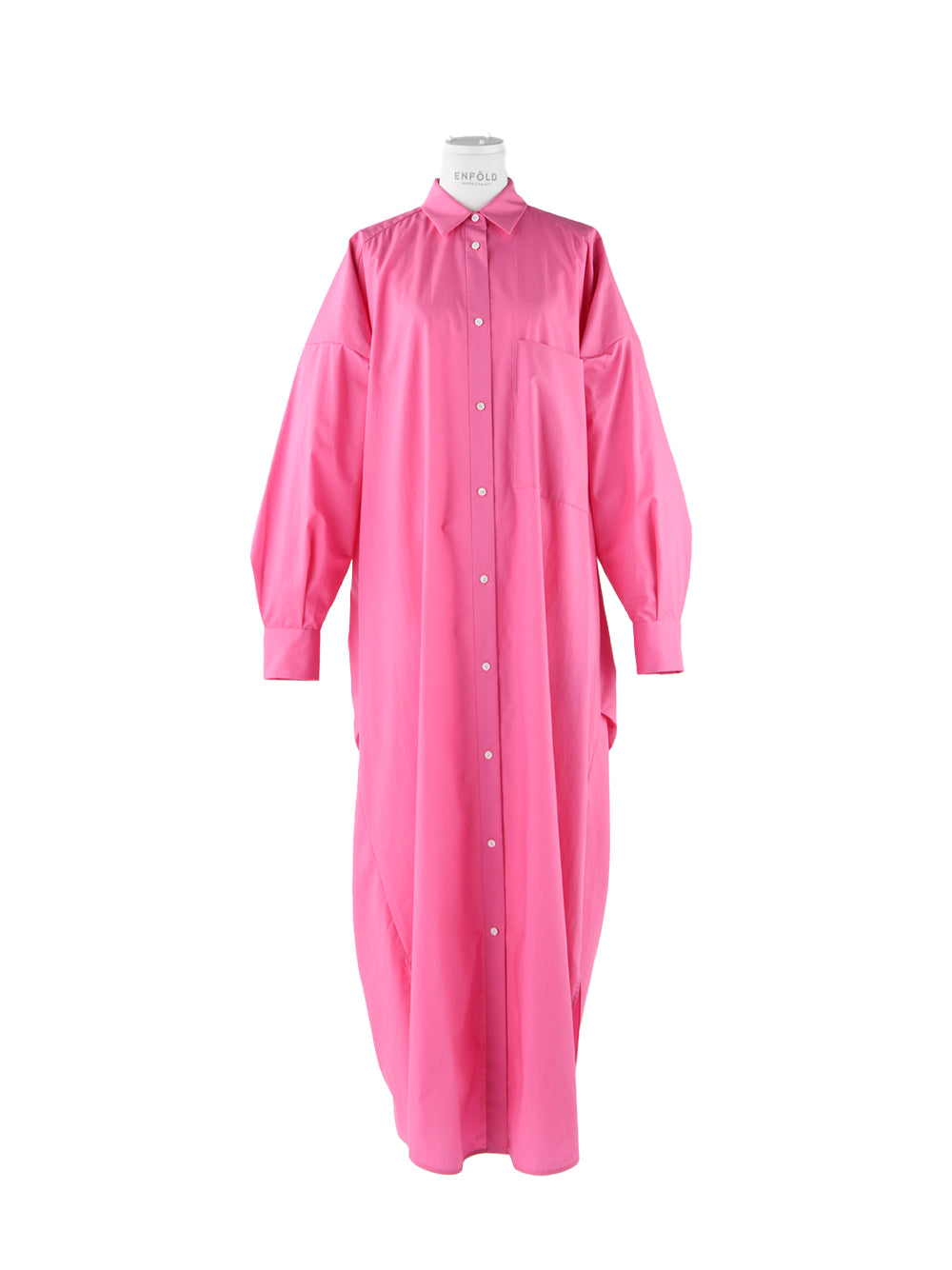 This shirt dress features a unique back design where drapes flow from curved armholes, unveiling voluminous sleeves. The standout feature is its ENFOLD-inspired tucked back style, lending a structured appearance from the side. Crafted from low-maintenance material, it's ideal for summer outings, ensuring worry-free wear amidst sweat and dirt concerns