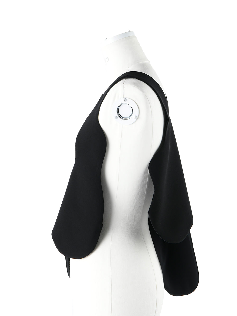 A vest with a stylish wave cut to accentuate your look. Pair it with a shirt or dress for added glamour. It features no clasp on the left side, ensuring suitability for various body types. This season's must-have, this vest effortlessly elevates any outfit. Crafted with a special yarn for a natural stretch and a soft, light double cloth material against the skin.
