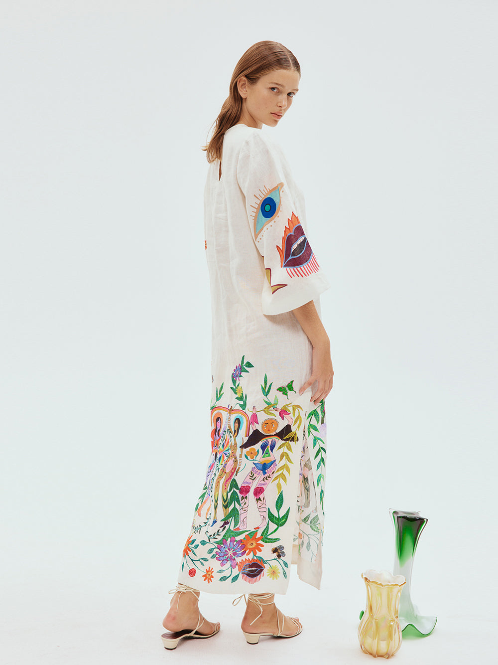 เดรสโอเวอร์ไซซ์จากแบรนด์ ALÉMAIS ดีเทลคอเสื้อตัวยูพร้อมกระดุมติดด้านหลังคอเสื้อ โดดเด่นด้วยลายพิมพ์ลวดลายธรรมชาติฝีมือศิลปินชาวอเมริกัน Meagan Boyd (เมแกน บอยด์) ไอเทมสวมใส่สบายที่ผสมผสานศิลปะเสื้อผ้าเข้ากับปรัชญาความตั้งใจของแบรนด์ที่ห่วงใยในสิ่งแวดล้อม นำไปแมทช์กับกระเป๋าโท้ทสาน หรือกระเป๋าสะพายไหล่โอเวอไซซ์ช่วยคอมพลีทแฟชั่นแคชชวลสุดชิคของคุณให้โดดเด่น