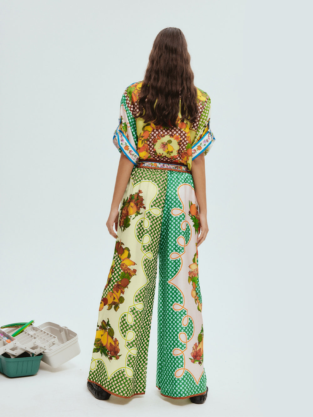 Lemonis Silk Shirt, a vibrant and comfortable addition to your wardrobe. This shirt features a relaxed silhouette and a point collar for a classic touch. The rolled sleeve hem with tab and shell button adds a laid-back feel. Adorned with a lemon print and green pattern, it showcases Sicilian-style prints with contrast color hems for an elegant finish.