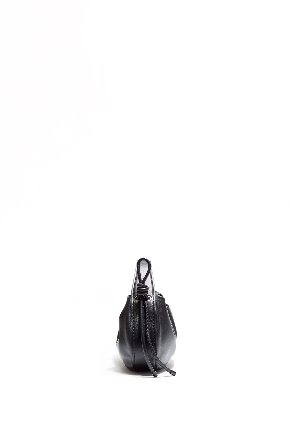 กระเป๋าถือสีดำใบเล็กทรงโอริกามิ หนังนิ่มยืดหยุ่น ติดโลโก้โลหะสีเงินด้านหน้า หูหิ้วดีไซน์ผูกเป็นปม ด้านในมีช่องใส่บัตร ปิดด้วยแม่เหล็กด้านบน