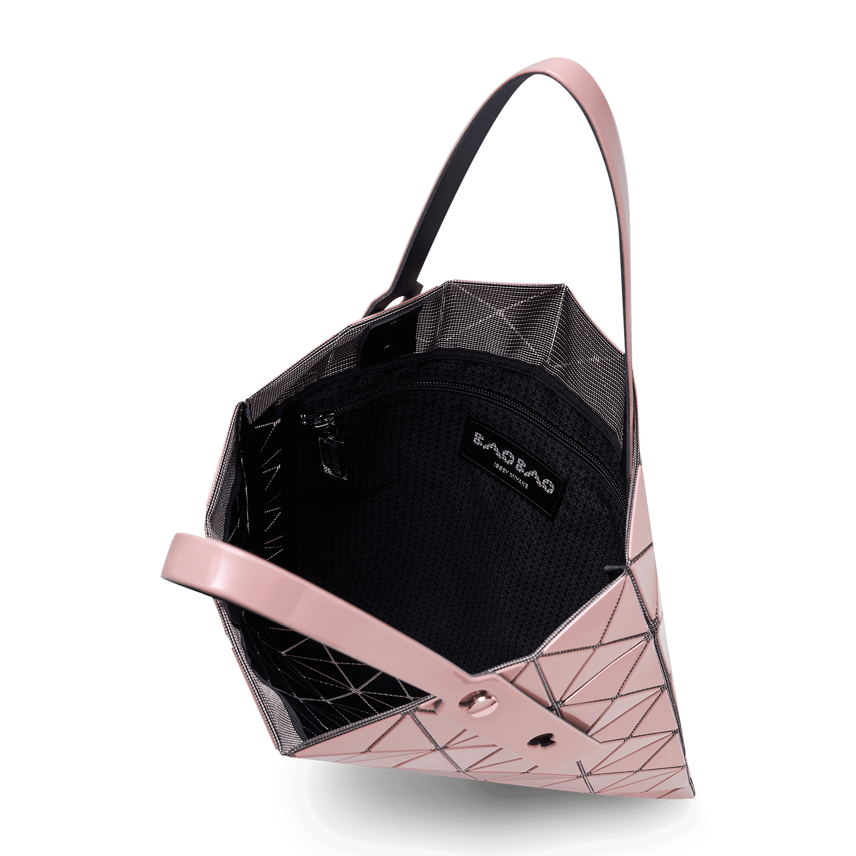 กระเป๋าโท้ท Lucent One โดย BAO BAO ISSEY MIYAKE มีหูหิ้วที่สามารถปรับได้และช่องซิปด้านในที่เก็บของได้อย่างปลอดภัย Lucent One-Tone ผสมผสานชิ้นส่วนสามเหลี่ยมของวัสดุอีนาเมลเมทัลลิคโพลาไรซ์เข้ากับผ้าฐานตาข่ายที่มีสีเดียวกัน ทำให้เกิดโทนสีเข้มและดูหรูหรา