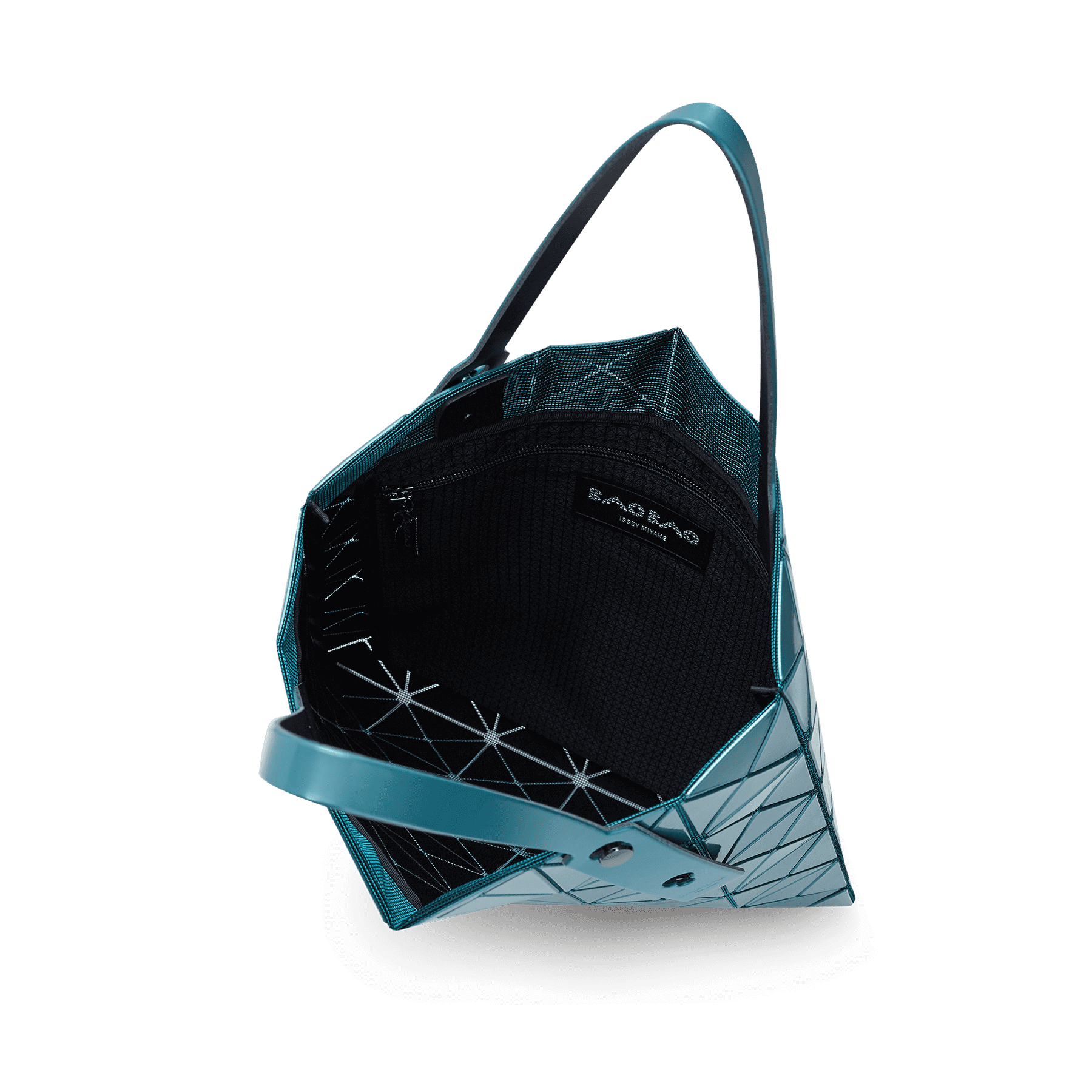 กระเป๋าโท้ท Lucent One โดย BAO BAO ISSEY MIYAKE มีหูหิ้วที่สามารถปรับได้และช่องซิปด้านในที่เก็บของได้อย่างปลอดภัย Lucent One-Tone ผสมผสานชิ้นส่วนสามเหลี่ยมของวัสดุอีนาเมลเมทัลลิคโพลาไรซ์เข้ากับผ้าฐานตาข่ายที่มีสีเดียวกัน ทำให้เกิดโทนสีเข้มและดูหรูหรา