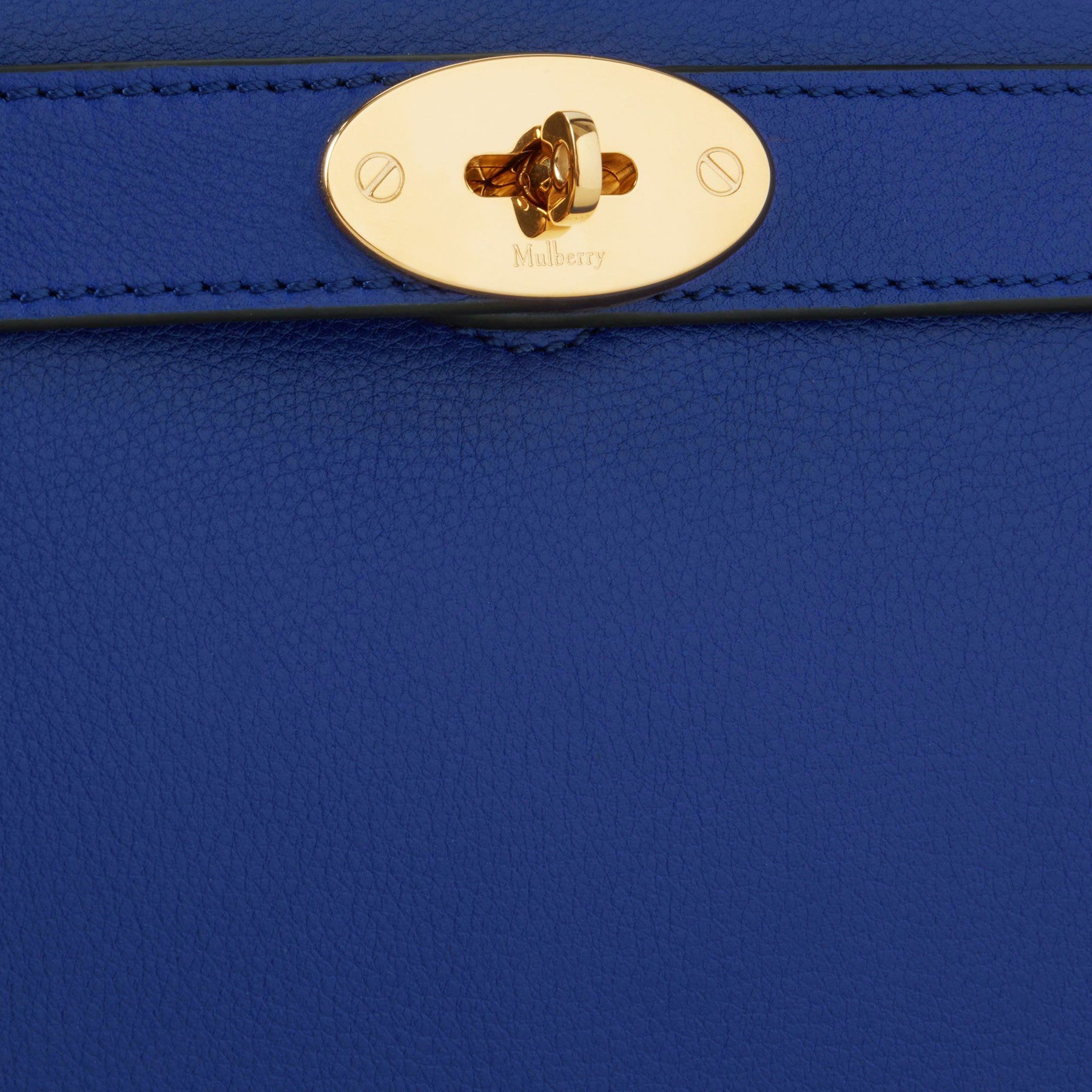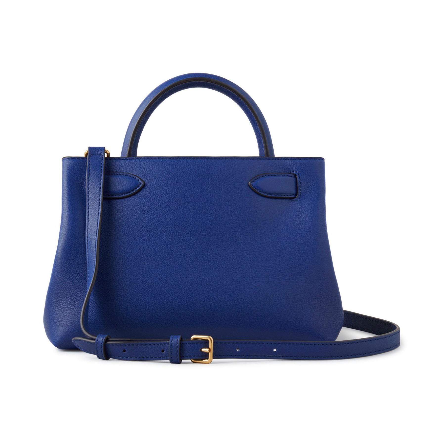 กระเป๋าสะพายหนังสีน้ำเงิน มาพร้อมหูหิ้วและสายสะพายแบบปรับได้ ด้านหน้าแต่งตัวล็อคอะไหล่โลหะสีทอง