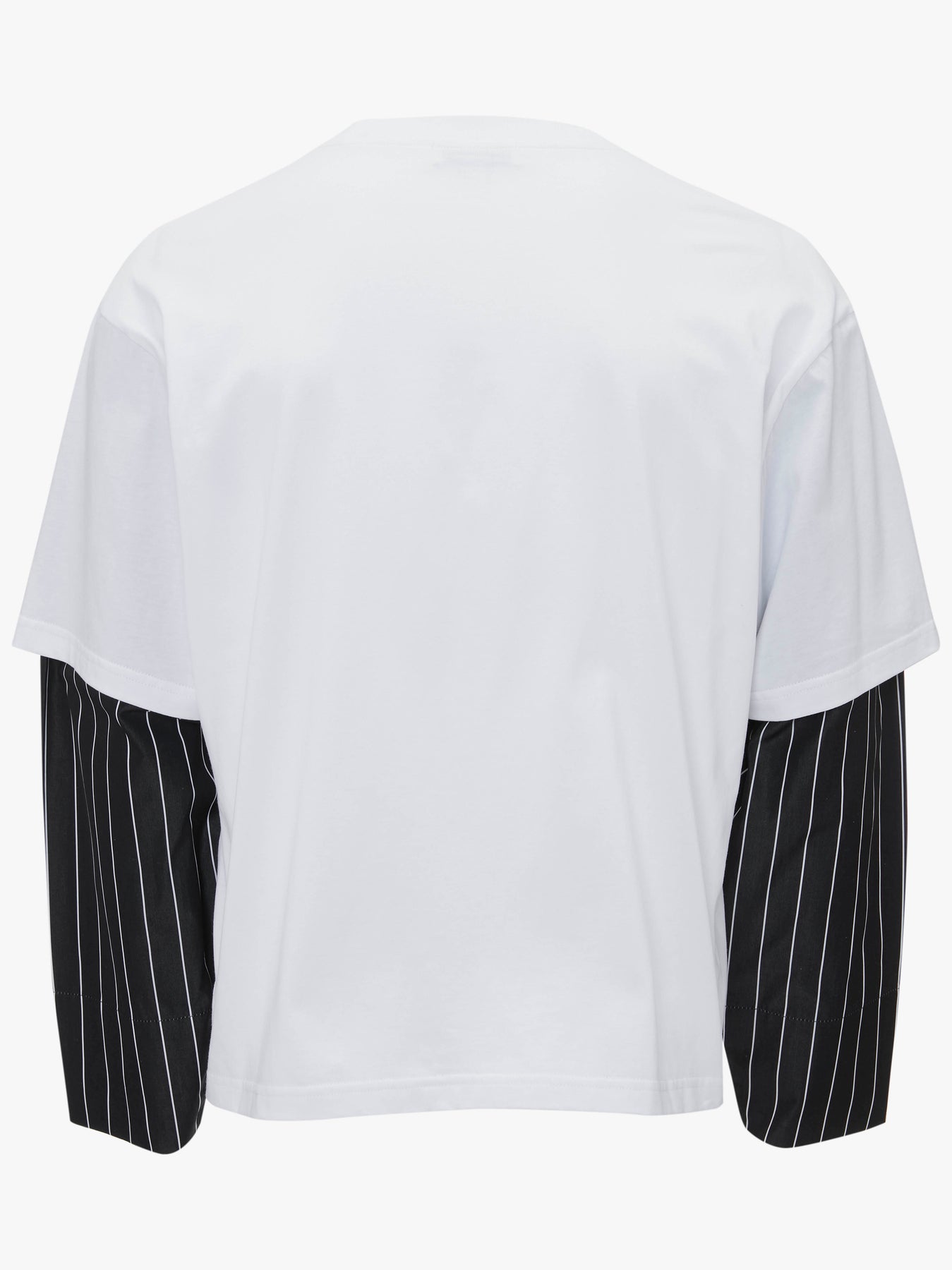 เสื้อยืดคอกลมแขนสั้นสีขาว ตัดเย็บด้วยผ้าคอตตอน ดีไซน์ตัวเสื้อสองชั้นมีแขนยาวลายทางด้านในสีดำ ดีเทลหน้าอกด้านซ้ายตกแต่งโลโก้แบรนด์