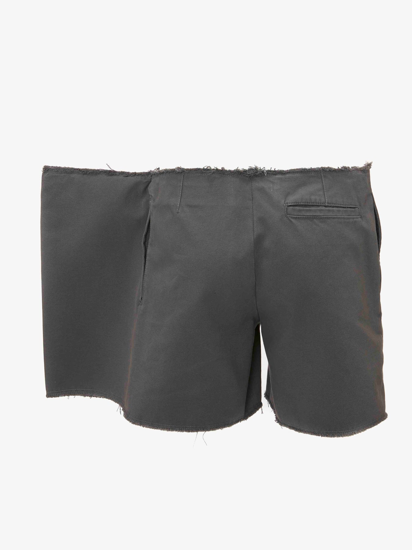 กางเกงขาสั้นจากแบรนด์ JW Anderson ดีเทลตะขอเกี่ยวกางเกงพร้อมซิปรูด ความยาวกางเกงเหนือเข่า โดดเด่นด้วยเทคนิคต่อผ้าให้ยื่นออกด้านข้างจากตัวกางเกง กิมมิคขอบกางเกงชายรุ่ย กระเป๋ากางเกงด้านข้างและด้านหลัง ชิ้นแฟชั่นคลาสสิคที่ถูกออกแบบให้มีความสนุกสนานมาพร้อมแพทเทิร์นสุดขี้เล่นเอกลักษณ์ประจำแบรนด์ หยิบนำมาสวมใส่เข้ากับกางเกงขายาวโอเวอร์ไซซ์พร้อมคอมพลีทโททัลลุคด้วยรองเท้าผ้าใบสีขาวสไตล์มินิมอล