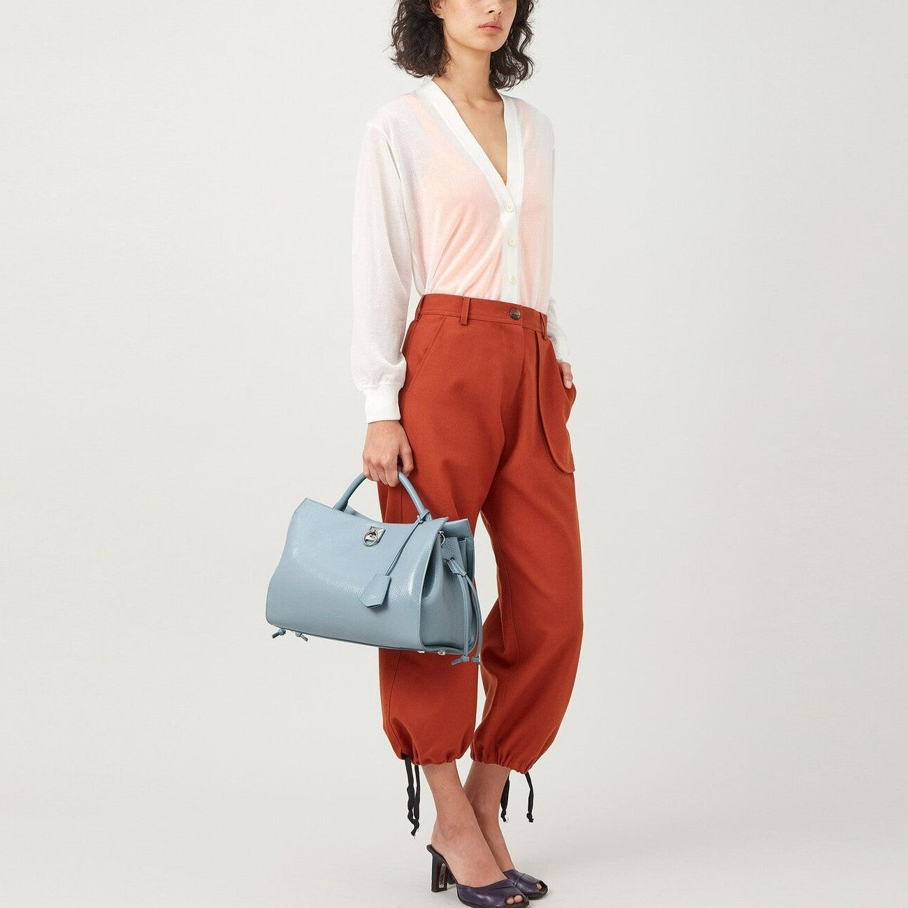 สุดทันสมัยกับกระเป๋าที่สามารถปรับให้มีรูปทรงเฉพาะตัวด้วยสายรัดสองด้านสำหรับปรับระดับ พร้อมหนังวัวนุ่มละเอียดมือ