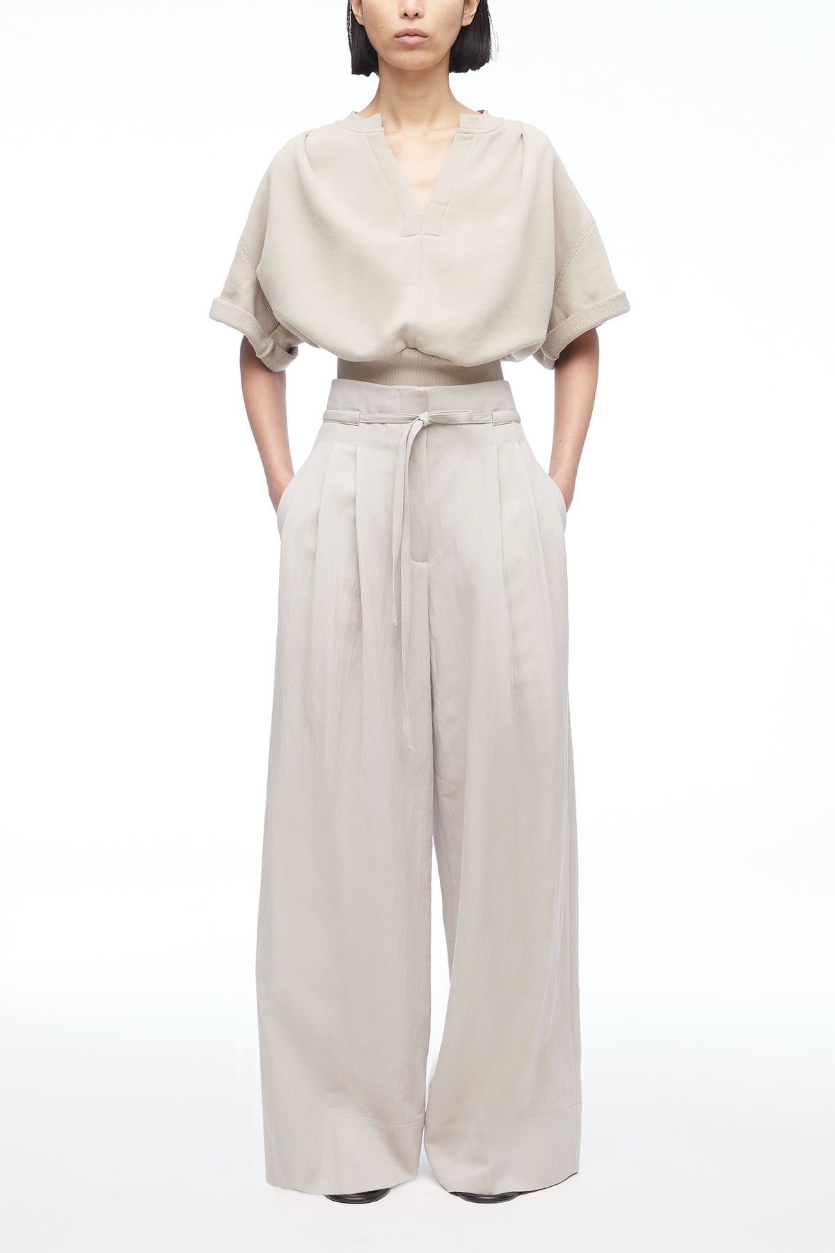 เสื้อสเวตเชิ้ตตคอวีแขนสั้นผ้าฝ้ายสีครีม ปลายแขนพับแต่งพอง