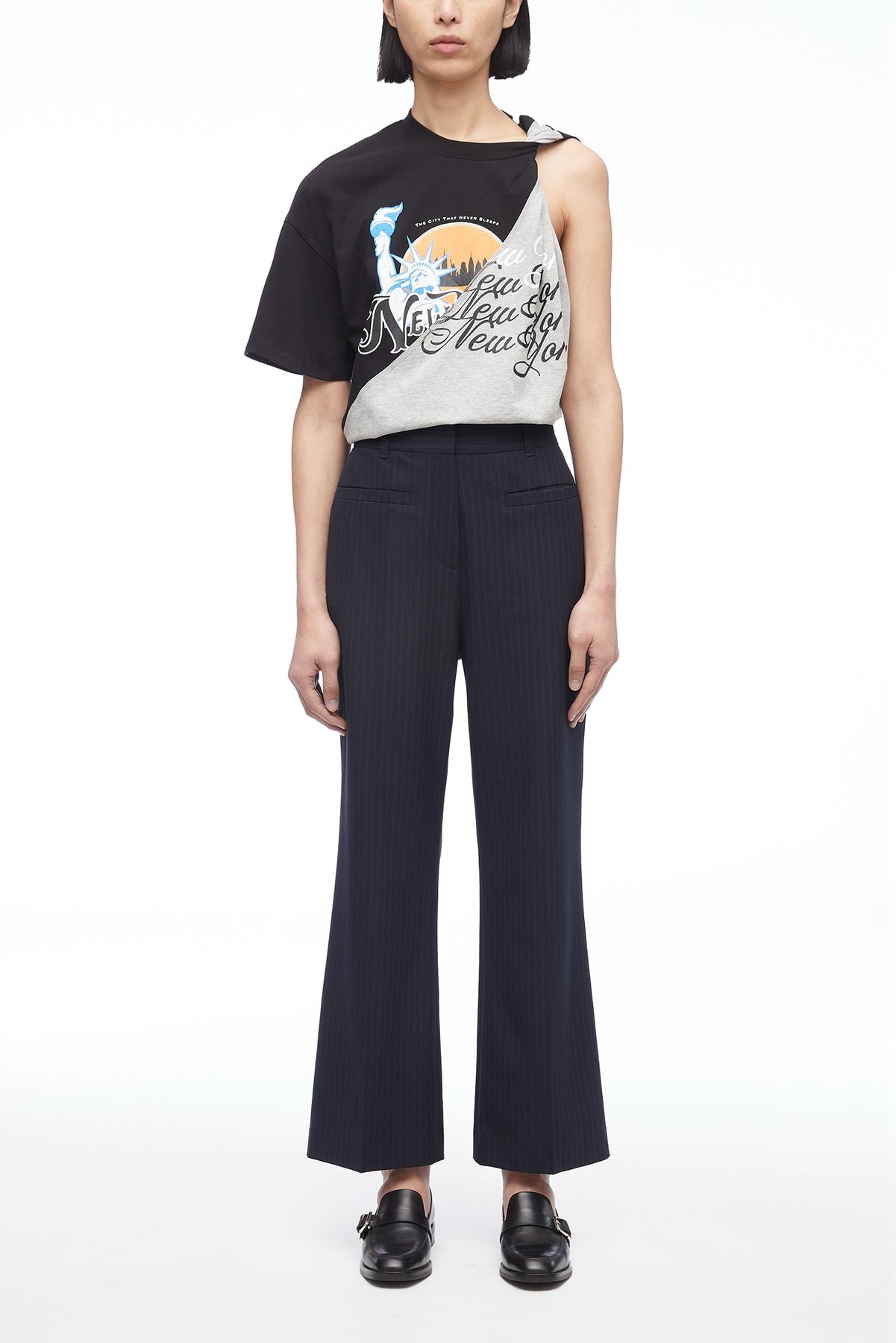 กางเกงผ้าเครปเอวสูงทรงขาบาน สีเทาลายทาง เอวมีห่วงร้อยเข็มขัด ช่องกระเป๋าด้านหน้า