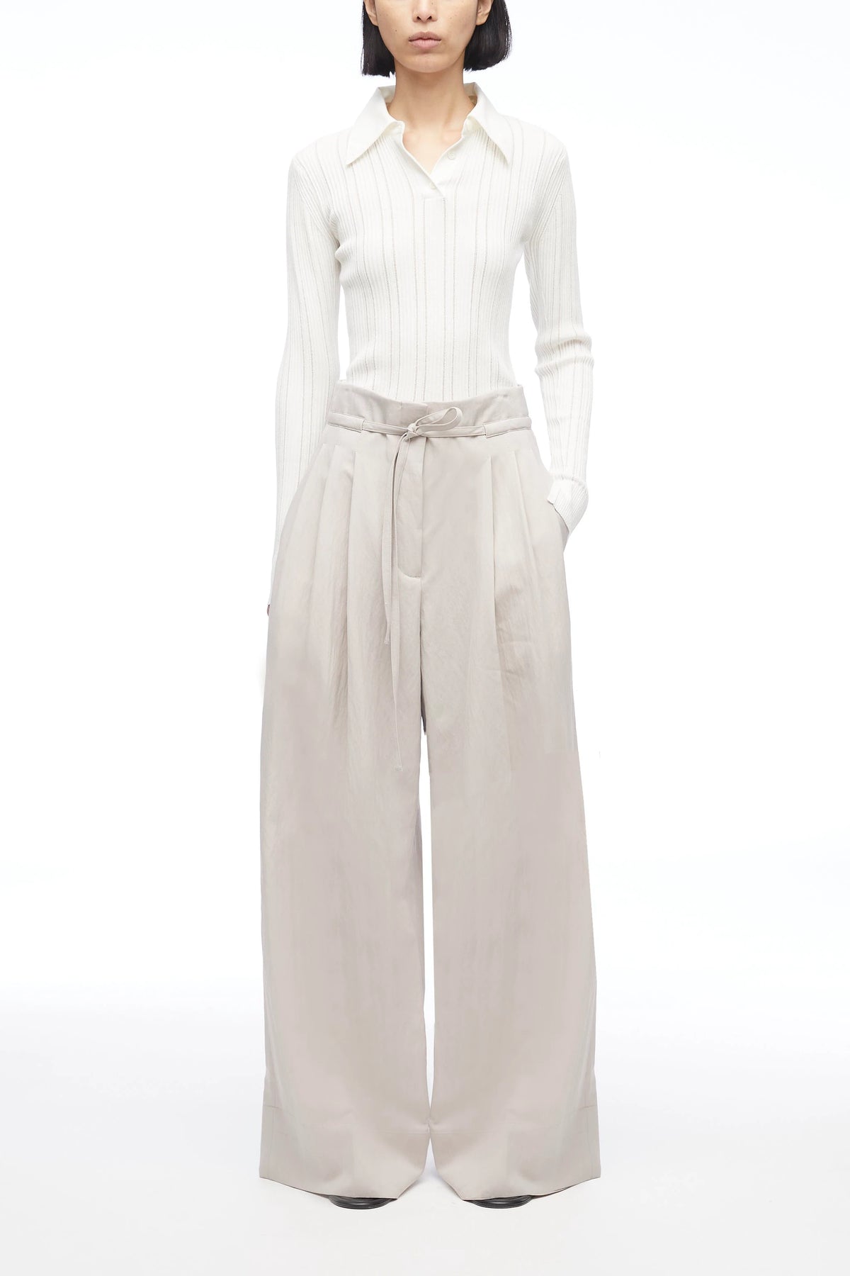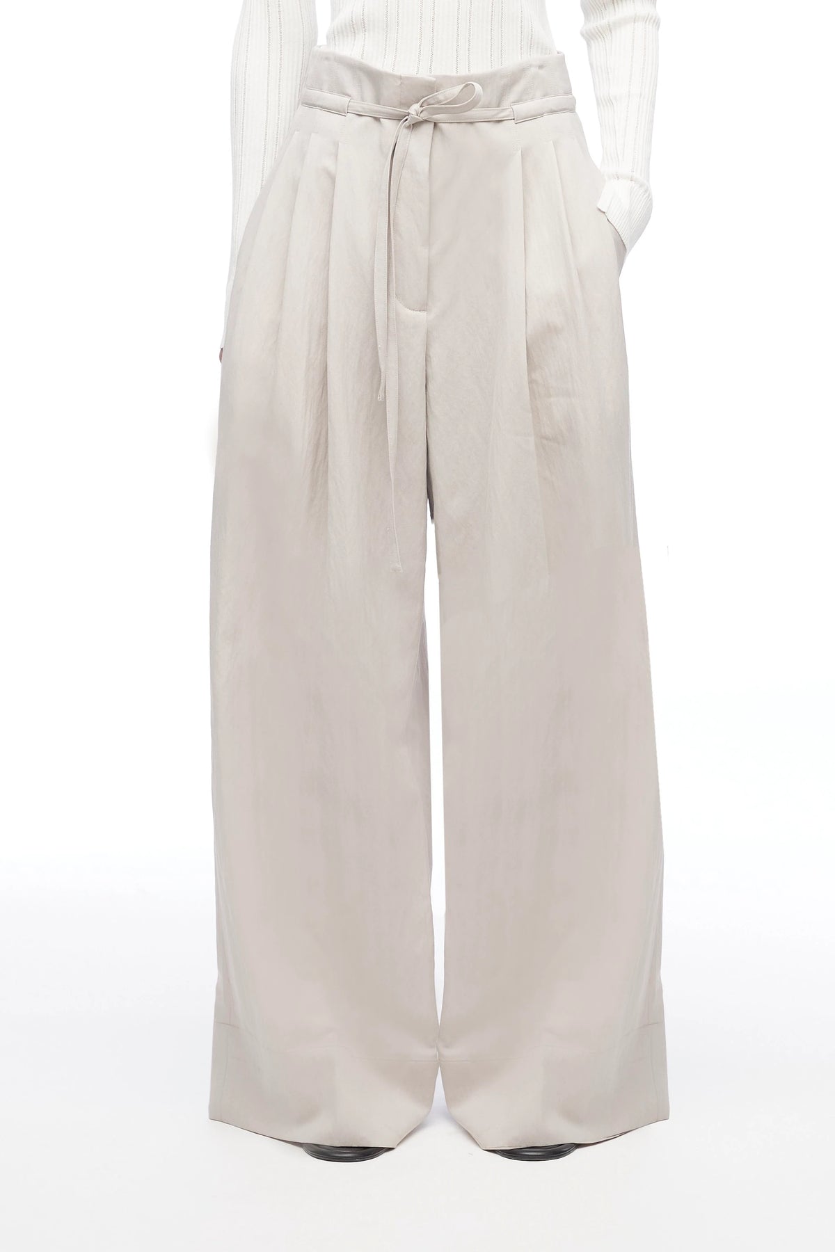 กางเกงเอวสูงขายาวผ้าวูลสีเทา ดีเทลแต่งจีบด้านหน้า มาพร้อมเชือกผูกเอว