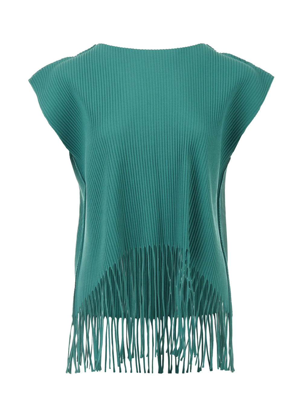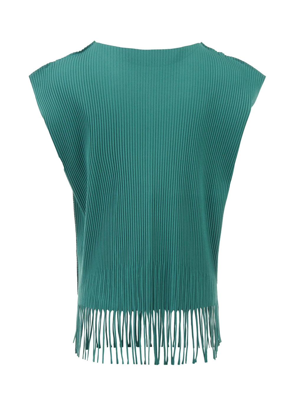This FINE KNIT PLEATS French-sleeved top is characterized by its lightweight, soft feel, and features pleats applied to knit material made with stretchy, thin, soft yarn. The highly expressive design features a fine fringe in an arched shape.
