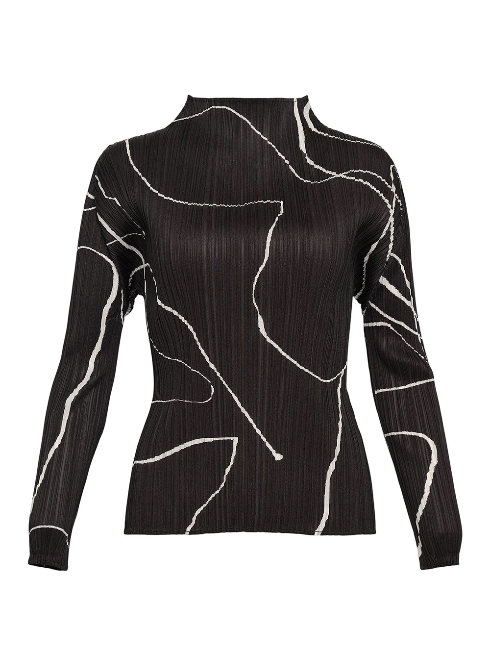 เสื้อแขนยาวอัดพลีตจากแบรนด์ PLEATS PLEASE ISSEY MIYAKE มาพร้อมดีไซน์คอปีน (Mock Neck) โดดเด่นด้วยลวดลายพิมพ์ PAUSE ที่ถ่ายทอดเส้นสายของเรือนร่างในหลากหลายท่วงท่า ผ่านเส้นโค้งที่พลิ้วไหว สื่อถึงความแข็งแกร่งและความสง่างามของช่วงเวลาที่หยุดนิ่งได้อย่างมีเอกลักษณ์