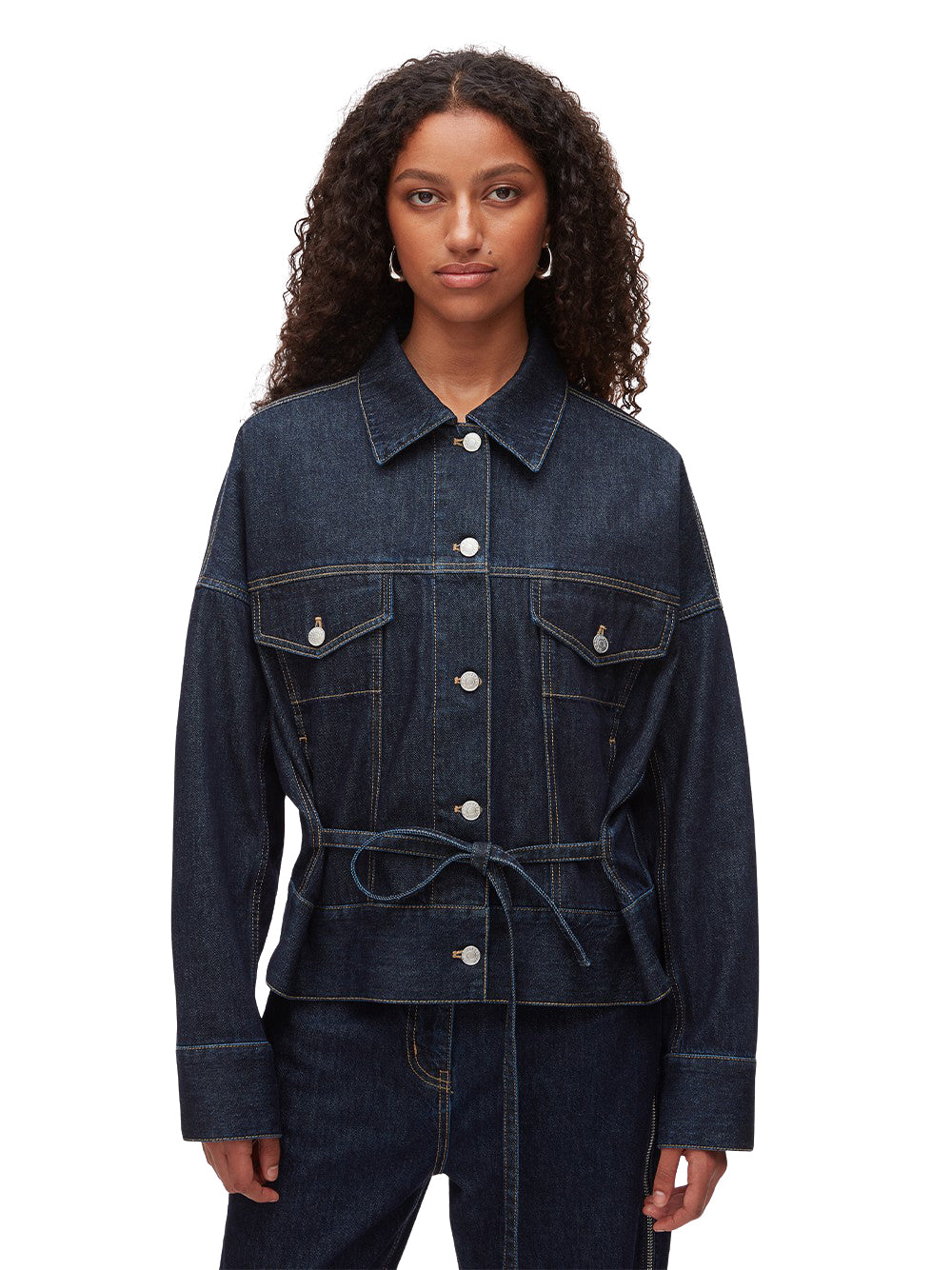 แจ็คเก็ตเดนิมแขนยาวจากแบรนด์ 3.1 Phillip Lim แจ็กเก็ตยีนส์ตัวนี้ตัดเย็บจากผ้ายีนส์คอตตอนสีครามเข้ม ดีไซน์ทรงบ็อกซี่ที่ถ่ายทอดสไตล์เท่แบบนิวยอร์กได้อย่างมีเอกลักษณ์ มาพร้อมสายผูกเอวที่สามารถปรับได้ตามต้องการ เพื่อช่วยเน้นสัดส่วนและสร้างสมดุลระหว่างโครงเสื้อที่มีโครงสร้างกับความสบาย สวมคู่กับกางเกงยีนส์สีเข้าชุดเพื่อคอมพลีตลุคเดนิมแบบหรู หรือแมทช์ทับเสื้อผ้าเทเลอริ่งเนื้อนุ่มเพื่อเพิ่มความเก๋แบบโมเดิร์นพร้อมลุยในเมือง