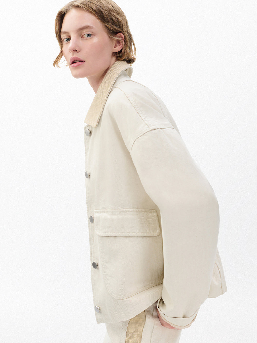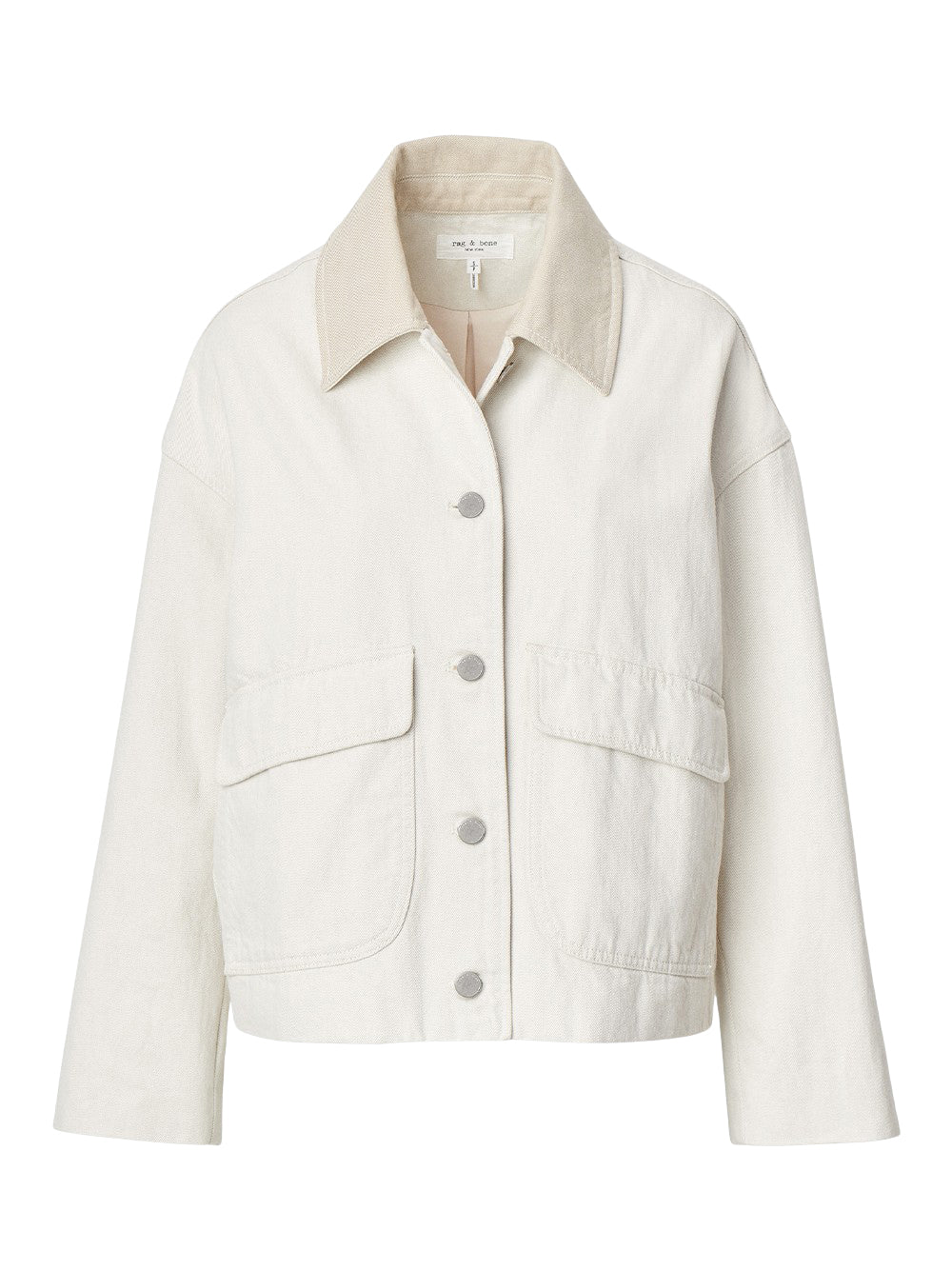 เสื้อแจ็คเก็ตแขนยาวจากแบรนด์ rag & bone ผลิตจากผ้าเดนิม Rigid น้ำหนักเบา แบบไม่ยืด ช่วยคงรูปทรงได้อย่างดี และจะค่อย ๆ นุ่มสบายมากขึ้นเมื่อสวมใส่ โดดเด่นด้วยโทนสี Two-Tone Stone เฉดเอครูนุ่มละมุน ตัดกับปกสีแซนด์สโตนอย่างลงตัว สามารถมิกซ์แอนด์แมตช์กับกางเกง Logan Spliced Wide-Leg Jeans เพื่อคอมพลีตลุคให้สมบูรณ์แบบและเข้าชุดกันอย่างมีสไตล์
