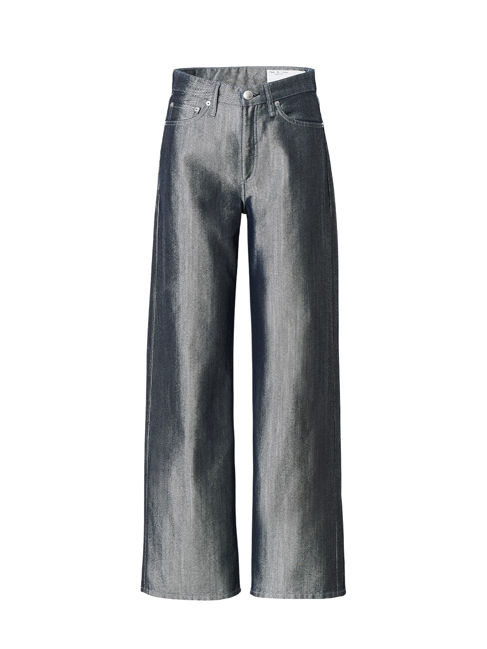 The Logan. Our laid-back, mid-rise jeans with a roomy fit through the hip and thigh down to a released hem. (Pro tip: Take your natural size and wear low on your waist for a relaxed look, or size down for a higher rise.) Crafted from Lightweight Rigid non-stretch denim that provides structure, but breaks in over time for a soft and comfortable feel. In Metallic Indigo, a dark indigo wash woven with metallic yarns for holiday-ready shine.