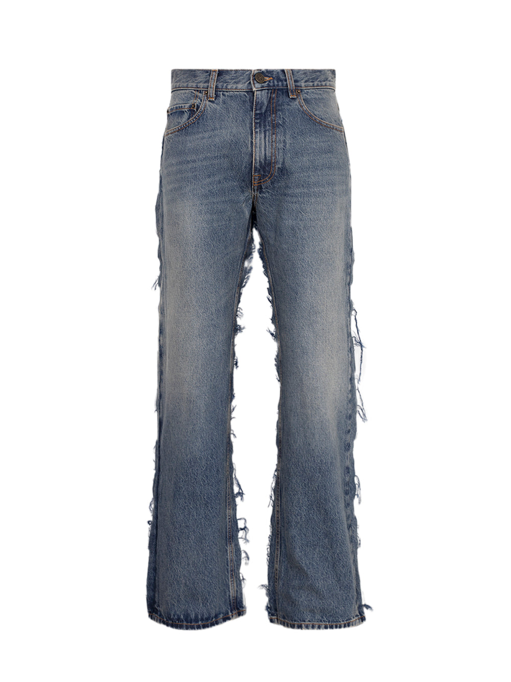กางเกงเดนิมขายาวจากแบรนด์ VETEMENTS ถ่ายทอดซิลูเอตเดนิมร่วมสมัยผ่านทรง Bootcut ที่โดดเด่นด้วยดีไซน์ Cut-Up ด้านหลัง เพิ่มมิติและเอกลักษณ์ในสไตล์สตรีทแฟชั่น พื้นผิวกางเกงผ่านการทำ Fading และ Whiskering เพื่อสร้างลุควินเทจที่มีคาแรกเตอร์ ดีไซน์แบบ Five-Pocket พร้อม Belt Loops และ Zip Fly ช่วยให้สวมใส่สะดวกและใช้งานได้จริง เสริมรายละเอียดด้วยโลโก้แพตช์หนังที่เอวด้านหลังและฮาร์ดแวร์โลโก้แกะสลักโทนเงินและทองแดง เพื่อเติมเต็มเอกลักษณ์ของแบรนด์อย่างลงตัว