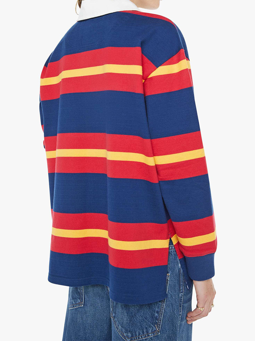 เสื้อรักบี้จากแบรนด์ MOTHER โดดเด่นด้วยดีไซน์ไหล่ตกและทรงบ็อกซี่ที่ให้ลุคสบายแต่มีสไตล์ ผลิตจากผ้าคอตตอนผสมคอตตอนรีไซเคิล โดดเด่นด้วยลายทางสีแดง กรมท่า และเหลืองทอง พร้อมดีเทลแพตช์ลูกแกะเนื้อนุ่มที่หน้าอก ชิ้นแฟชั่นที่ได้แรงบันดาลใจจากไลฟ์สไตล์สุดรีแล็กซ์ตามแบบฉบับชาวแอลเอ (Los Angeles)