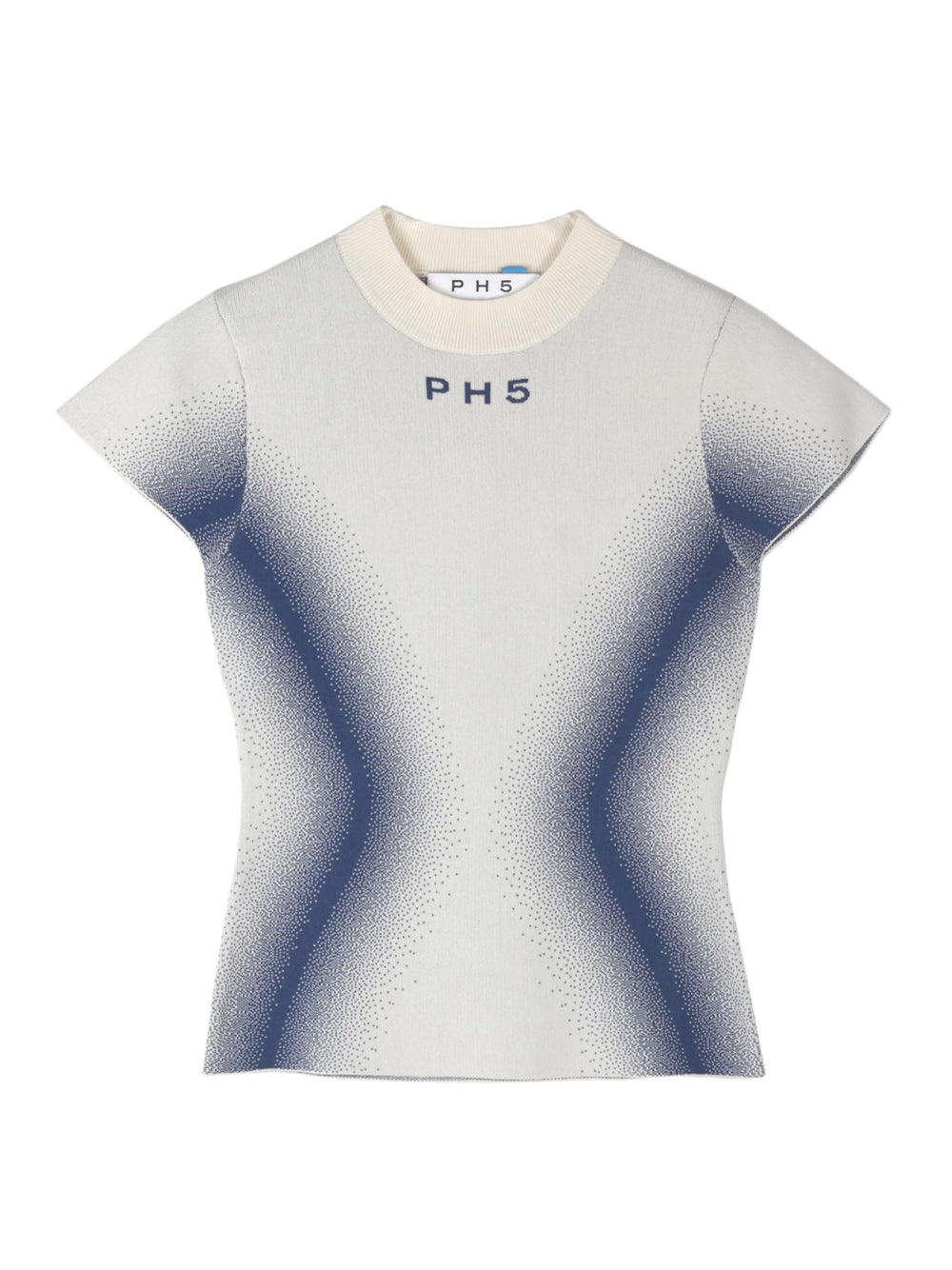 เสื้อยืดแขนสั้นจากแบรนด์ PH5 ที่ผสมผสานสไตล์เฟมินีนเข้ากับการออกแบบที่ล้ำสมัยอย่างลงตัว สามารถหยิบนำมาแมทช์เข้ากับกางเกงขาสั้นหรือกระโปรงเข้าเซ็ท แบรนด์แฟชั่นที่นำเอาเทคนิคการผลิตผ้าถัก (Knitwear) มาต่อยอดพัฒนากลายเป็นไอเทมเฟมินีนร่วมสมัยสำหรับผู้หญิง