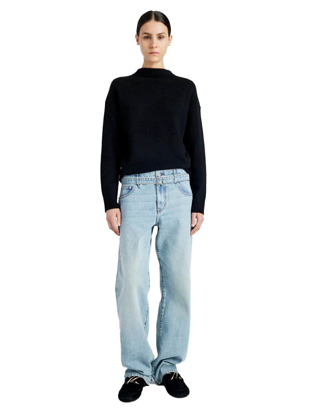 The Ellsworth Jean features a slouchy boyfriend cut. Designed with stretch and detailed with a monogram front button closure, these jeans come complete with a matching denim waist belt.