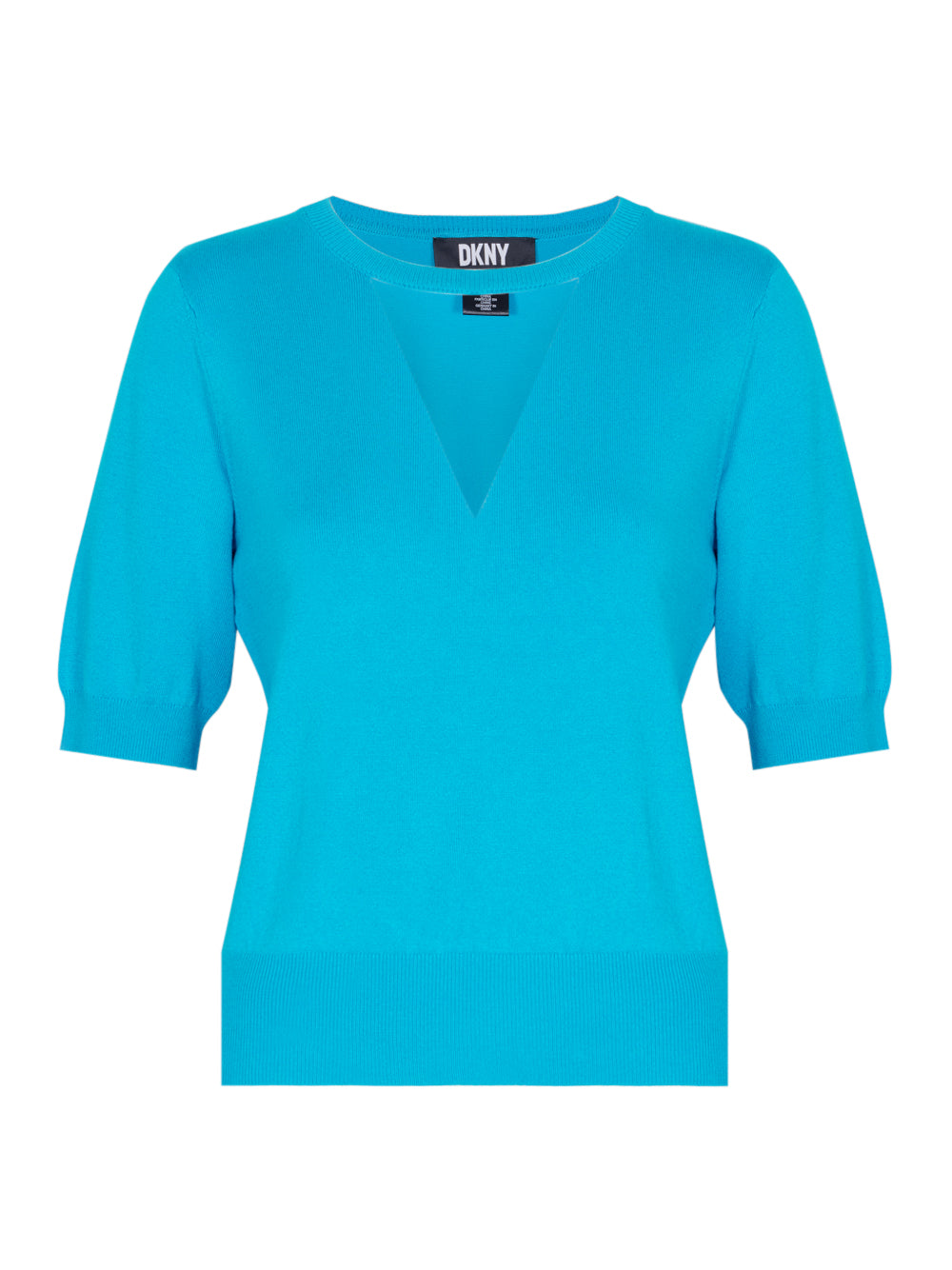 เสื้อพลูโอเวอร์แขนเสื้อสั้นจากแบรนด์ DKNY ดีเทลคอเสื้อตัวยู โดดเด่นด้วยกิมมิคผ้าตาข่ายซิลลูเอทตัววีบริเวณอกเสื้อ แขนเสื้อสั้นระดับข้อศอกและชายเสื้อตรง ไอเทมสำหรับโอกาสแคชชวลที่สามารถหยิบนำมาแมทช์เข้ากับกางเกงขายาวผ้าเดนิม คอมพลีทโททัลลุคด้วยแอคเซสเซอรีกระเป๋า และรองเท้าคู่โปรด