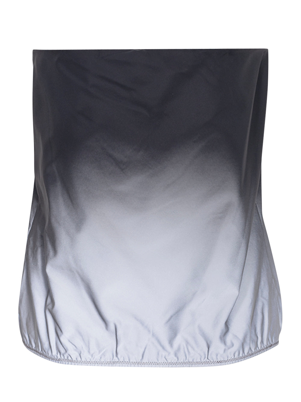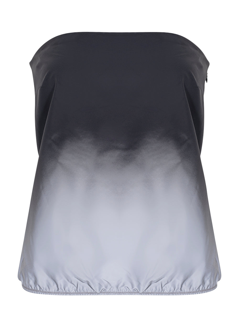 Silver-black strapless bubble top in reflective gradient fabrication. Defined by a blouson silhouette and sculpted edge, it brings structure and shine to evening layering.