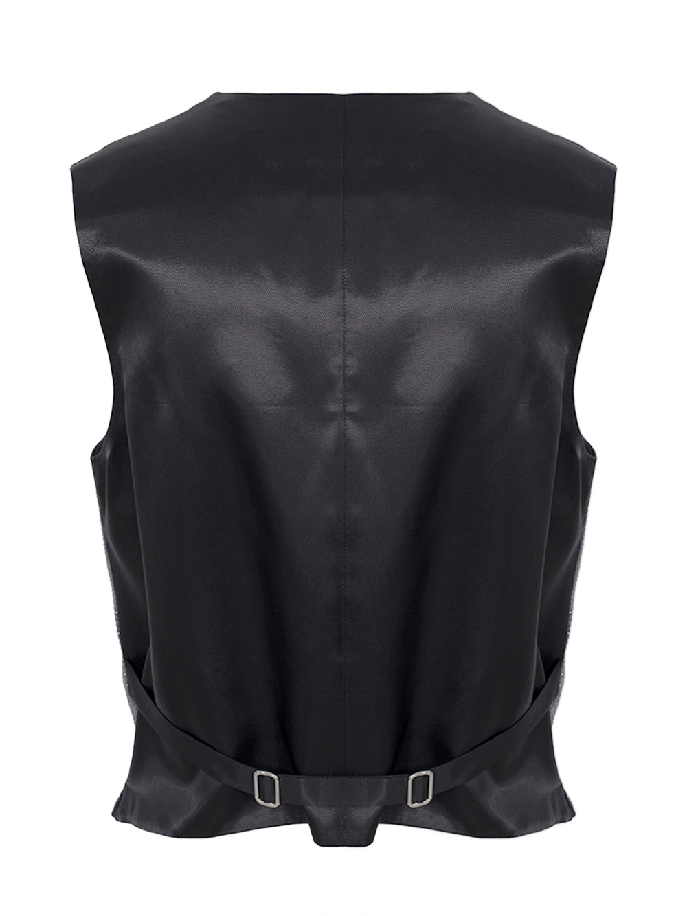Grey wool mohair tailored vest covered in clear hotfix. Designed with a V-neckline, button closure, and welt pockets at the hip, finished with an adjustable strap and full lining for precision fit.