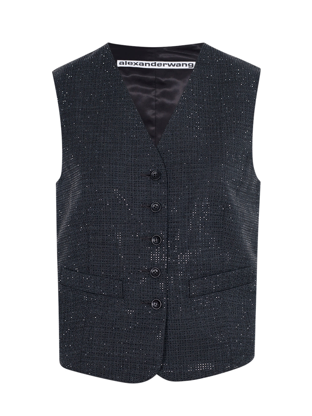 เสื้อกั๊กแขนกุด Alexander Wang ทรงเทเลอร์ ประดับฮอตฟิกซ์ใสทั่วตัว ออกแบบด้วยคอวี ปิดด้วยกระดุม ด้านหน้ามีกระเป๋าเวิลต์บริเวณสะโพก พร้อมสายรัดด้านหลังปรับได้ และซับในทั้งตัวเพื่อความเนี้ยบเป๊ะทุกสัดส่วน แบรนด์แฟชั่นสตรีทสุดขบถที่ผสมผสานระหว่างภาพลักษณ์ของหญิงสาวที่แข็งแกร่งเข้ากับความไม่สมบูรณ์แบบได้อย่างลงตัวพร้อมจะให้คุณมิกซ์แอนด์แมตช์ได้ในทุกวัน