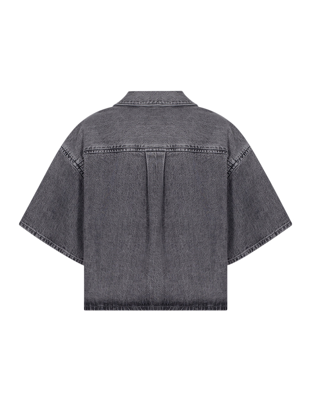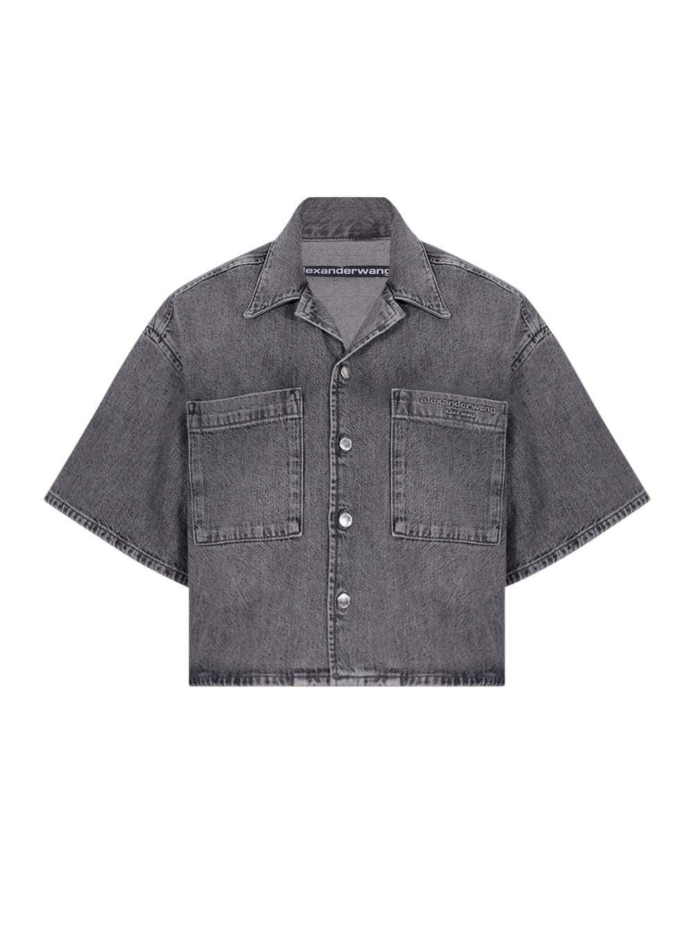 Light grey lightweight denim tailored into a cropped, boxy short sleeve shirt. Finished with a button-front closure and a logo-embossed chest pocket.