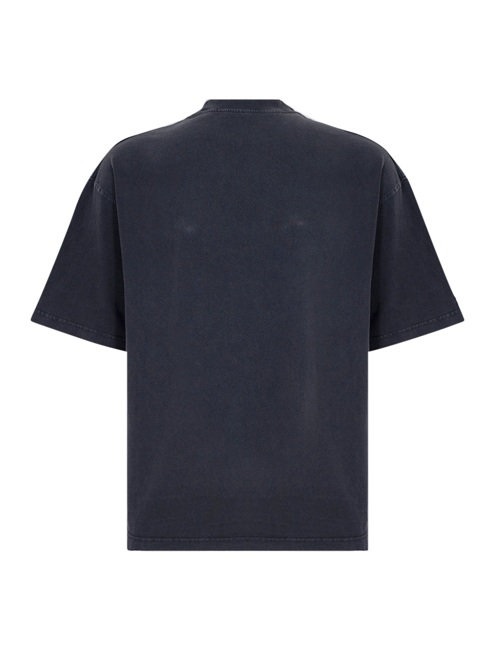 Oversized black cotton tee in dry jersey with ribbed collar and cuffs. Center chest features a lighter graphic. Designed with a relaxed drop-shoulder fit.