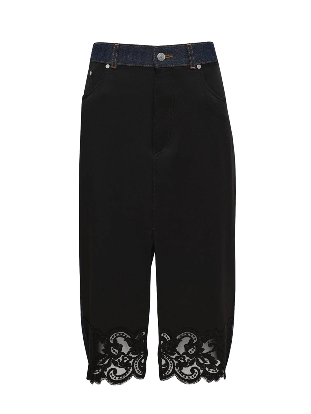 Mixed with cotton denim and woven lace-trimmed pieces, Stella McCartney's Slip Denim midi-skirt features five-pocket style, front and back slits, and a lace trim hem.