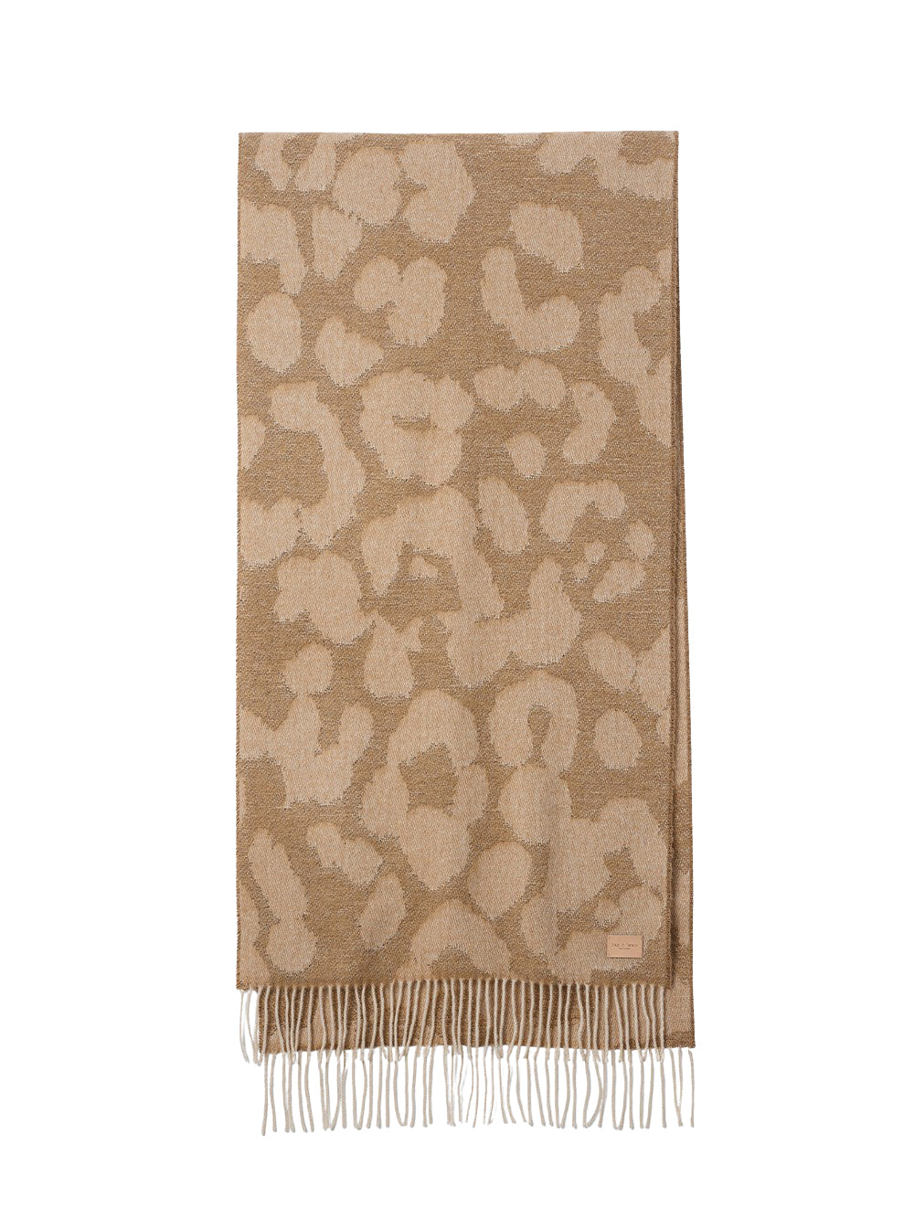 Statement staple. This extra-wide scarf is crafted in Italy from a soft wool blend with an abstract leopard print. Fringed edges and a a leather logo label complete its look.