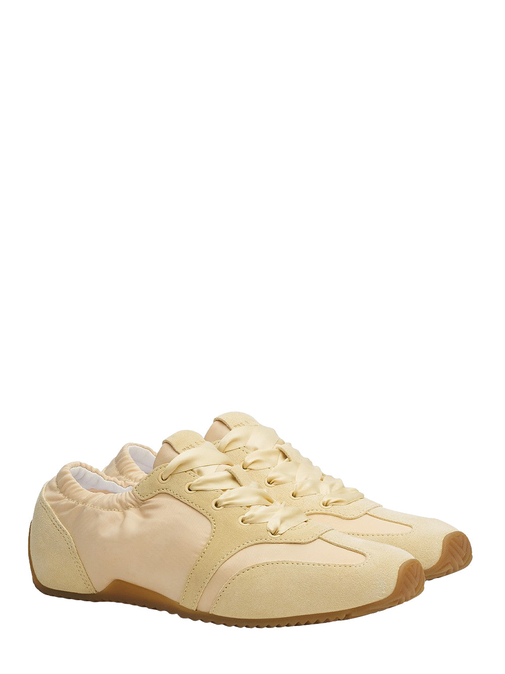 Ballet flats meet our (ultra) slim runners. Crafted from flexible twill and soft suede, these lace-up sneakers feature an elasticated collar that makes them easy to slip on and off. They're finished with tonal round and satin ribbon laces which tie in neat bows. Inside, breathable mesh-covered, dual-layer OrthoLite© foam insoles engineered for optimal stability, support, and comfort deliver that "new sneaker feel" with every step.