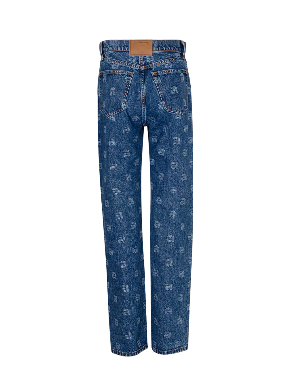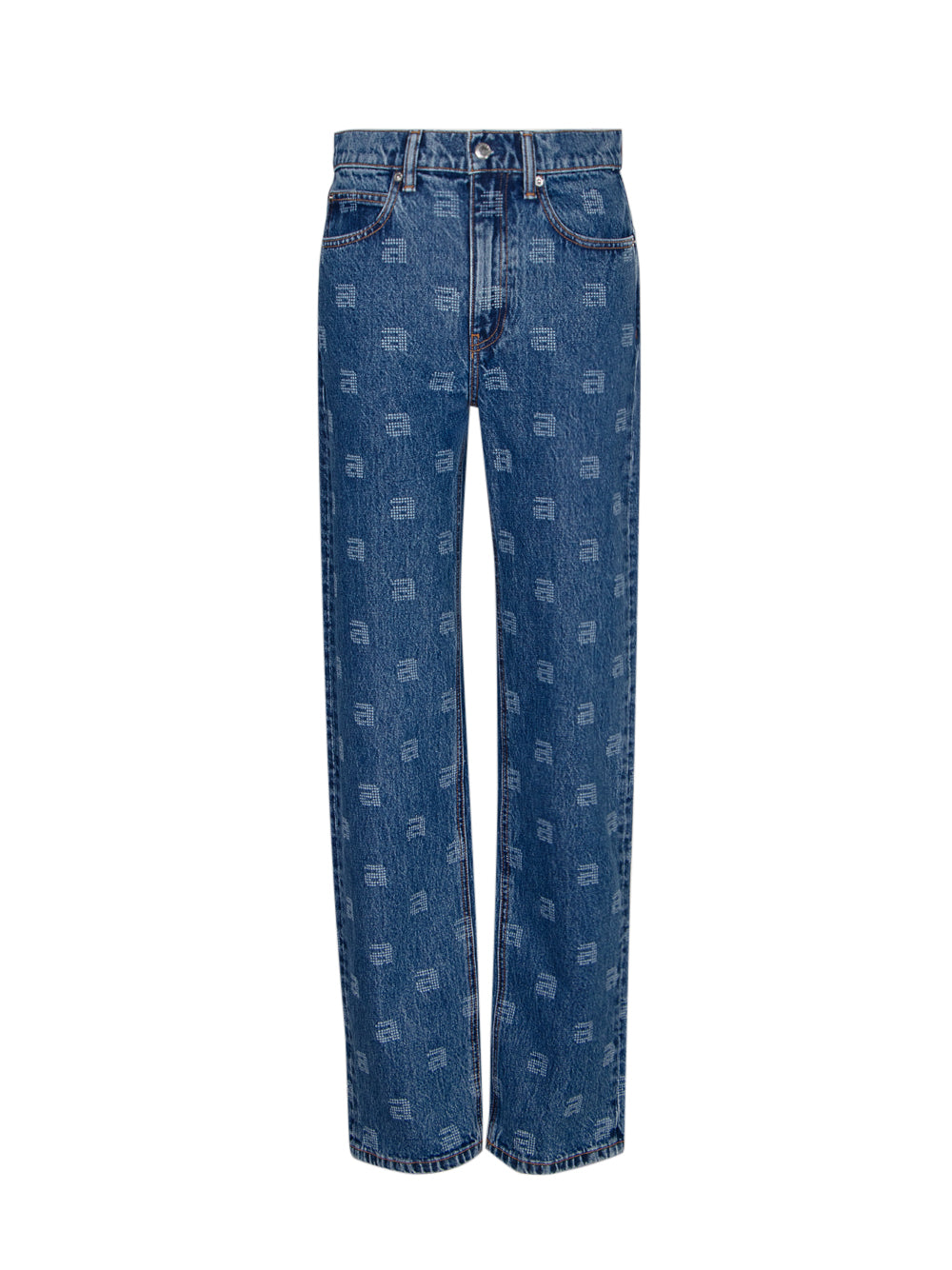 กางเกงยีนส์สีน้ำเงินเข้ม รุ่น Ez Mid-Rise Straight-Leg Jean ผลิตจากผ้าคอตตอนเดนิม ขาทรงตรงหลวม สวมใส่สบาย แต่งดีเทลยิงเลเซอร์ลาย "a" แบบรอบตัวกางเกง
